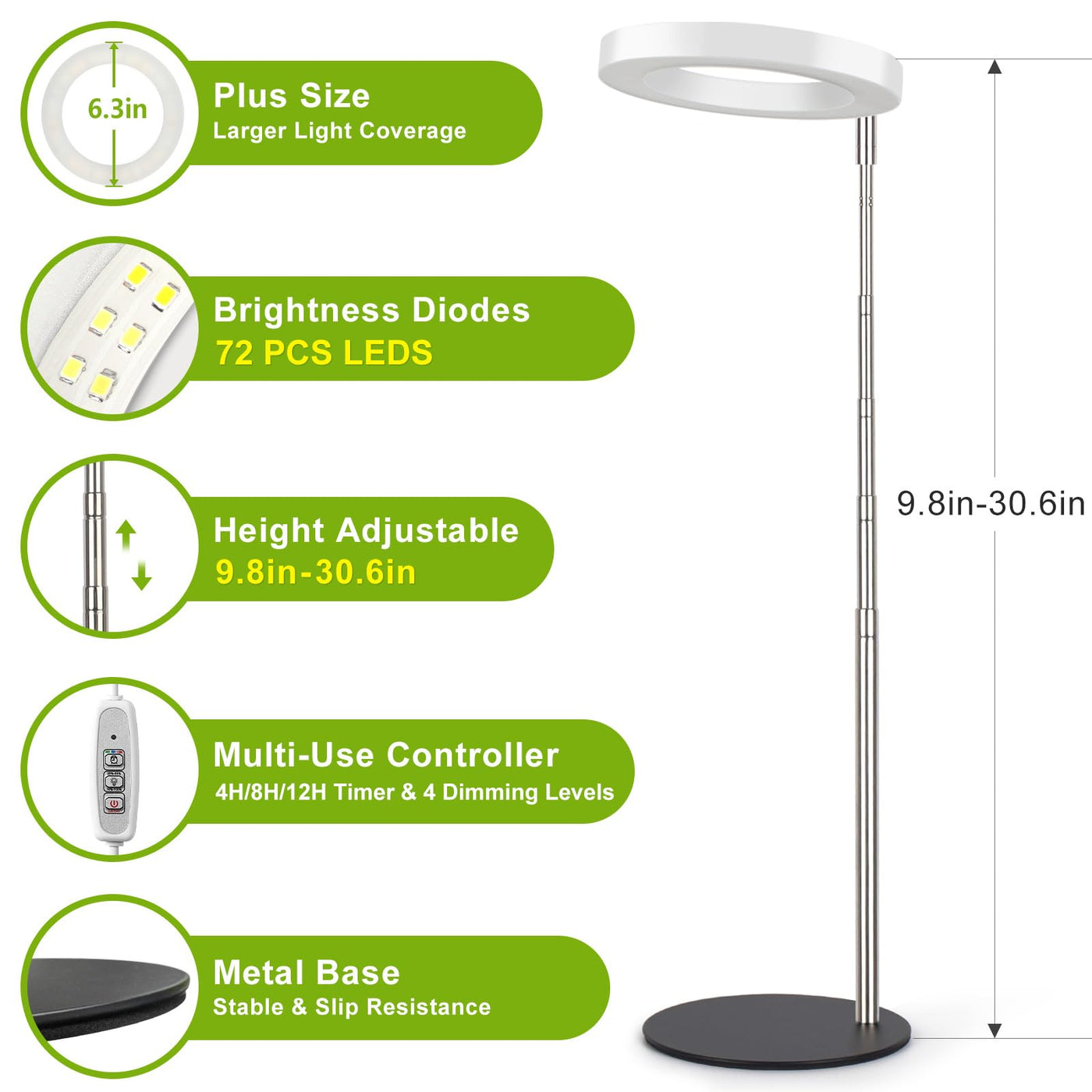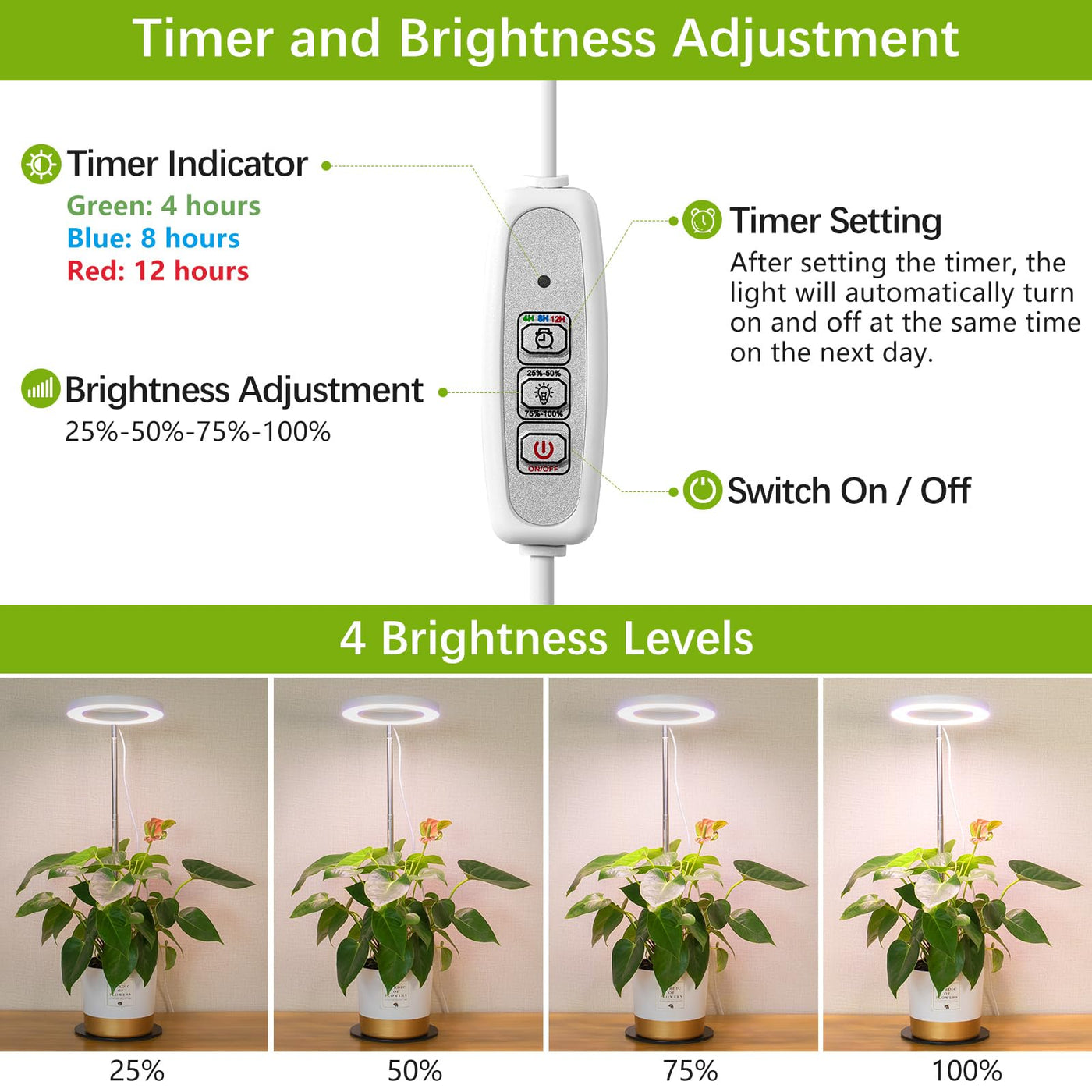 Q: How does the auto on/off timer work on this grow light?A: The grow light features an auto on/off timer with three timing cycle options (4H, 8H, and 12H). You can set it to turn on and off at the same time every day, which simplifies plant care, especially when you're busy or away.