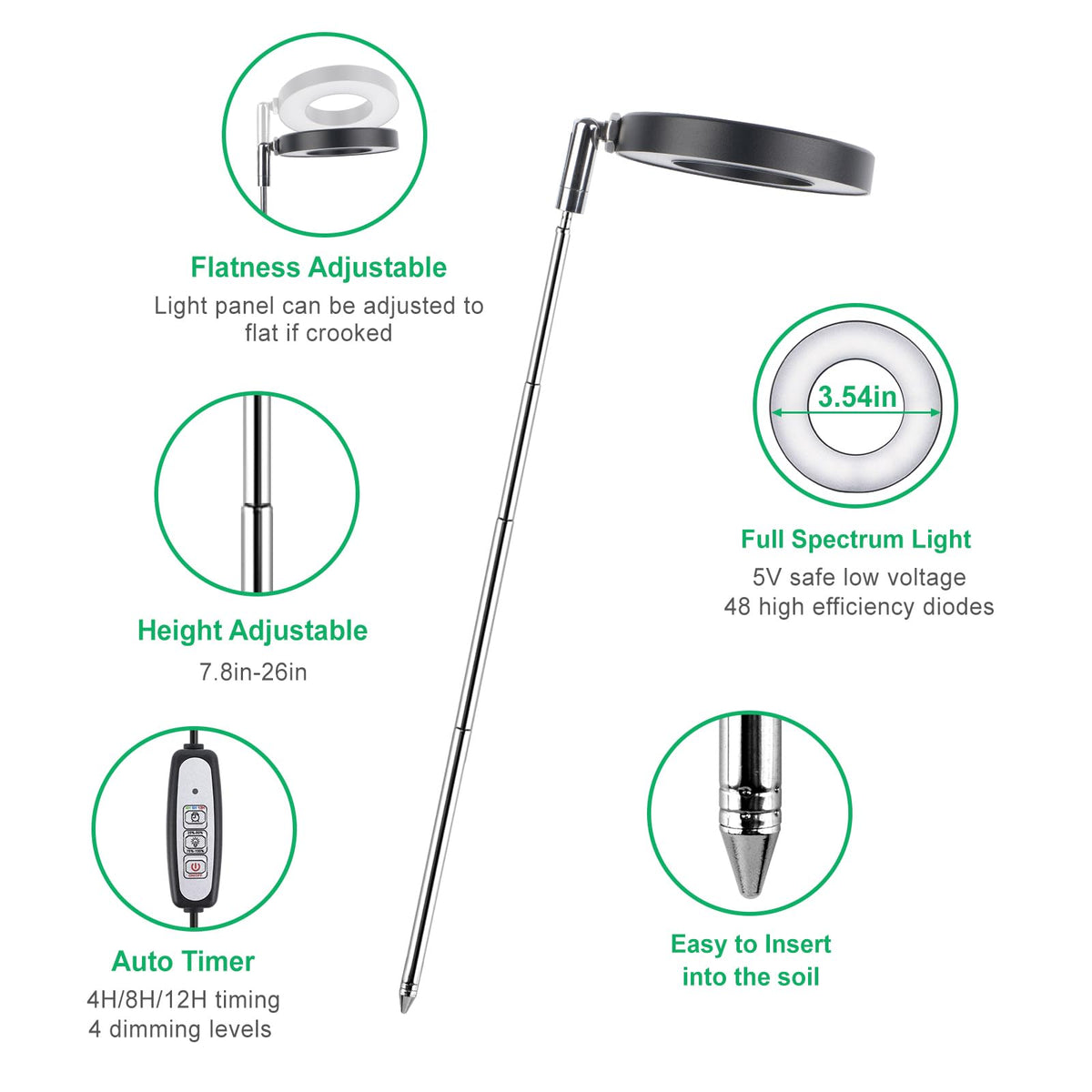 Q: What are the timer settings available on this grow light?A: The grow light features an auto on/off timer with three cycle settings: 4 hours, 8 hours, and 12 hours. It automatically turns off after the selected duration and will turn on at the same time the next day, ensuring your plants receive consistent lighting without the need for manual adjustments.