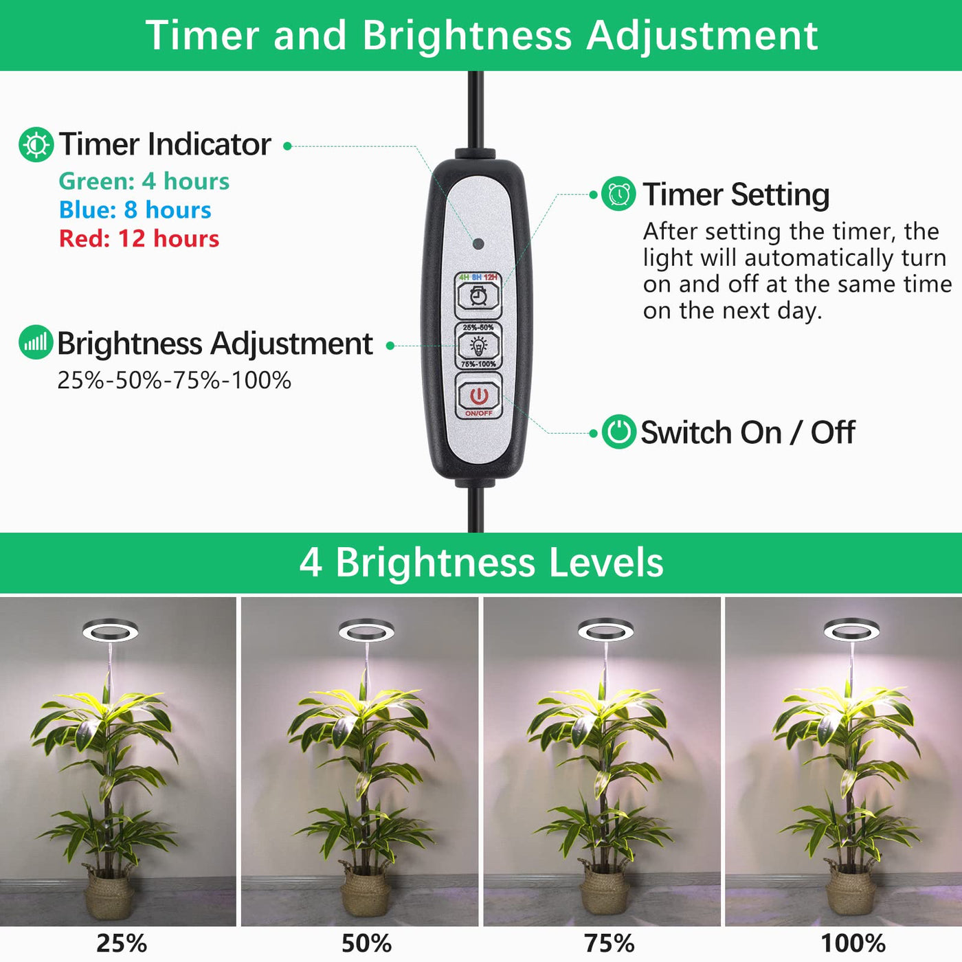 Q: Can I adjust the brightness of the LORDEM Plant Grow Light?A: Yes, the LORDEM Plant Grow Light comes with 4 dimmable brightness settings (25%, 50%, 75%, and 100%) to accommodate different light intensity needs for various types of plants.