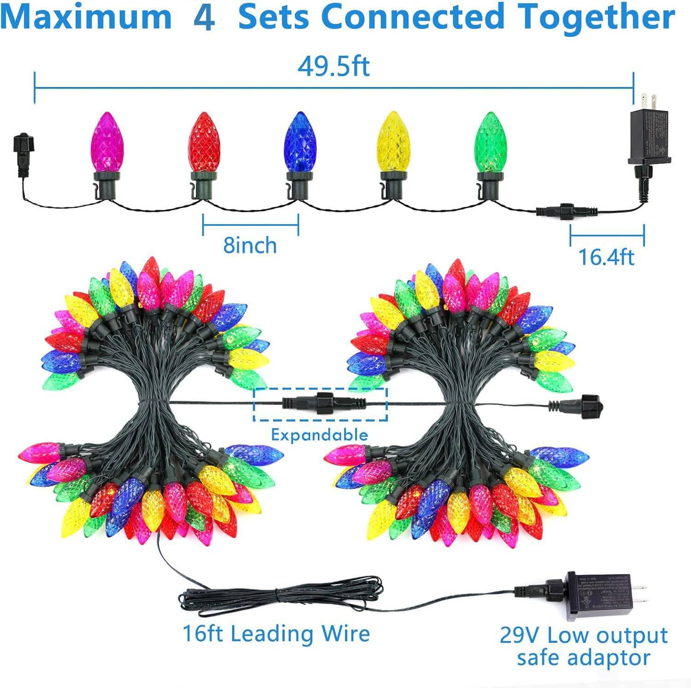 Q: Can the LORRYTE C9 Christmas lights be connected with other sets?A: Yes, these C9 Christmas lights are extendable and can be connected with up to ten sets together for larger decorative displays.