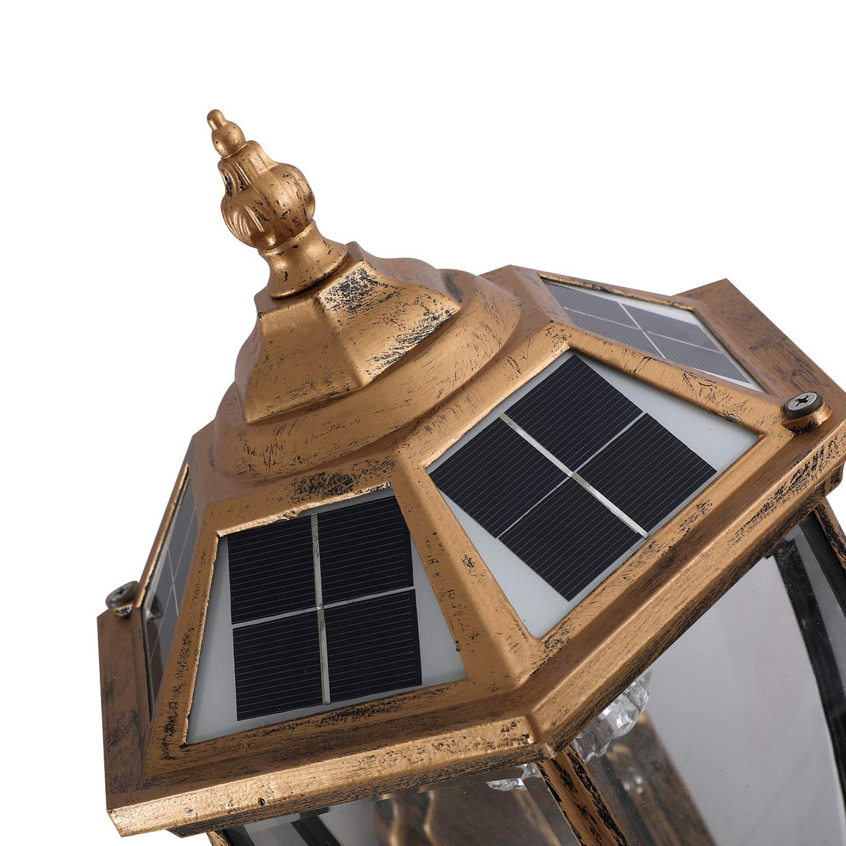 Q: What makes the design of this solar lamp unique?A: The lamp features an elegant hexagonal shape with a six-face transparent lampshade that casts a soft white or warm light, making it an attractive addition to your outdoor spaces like gardens, fences, and pathways.