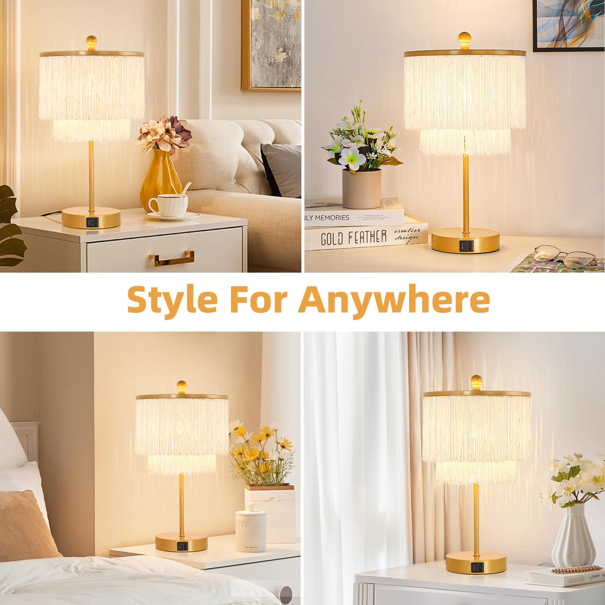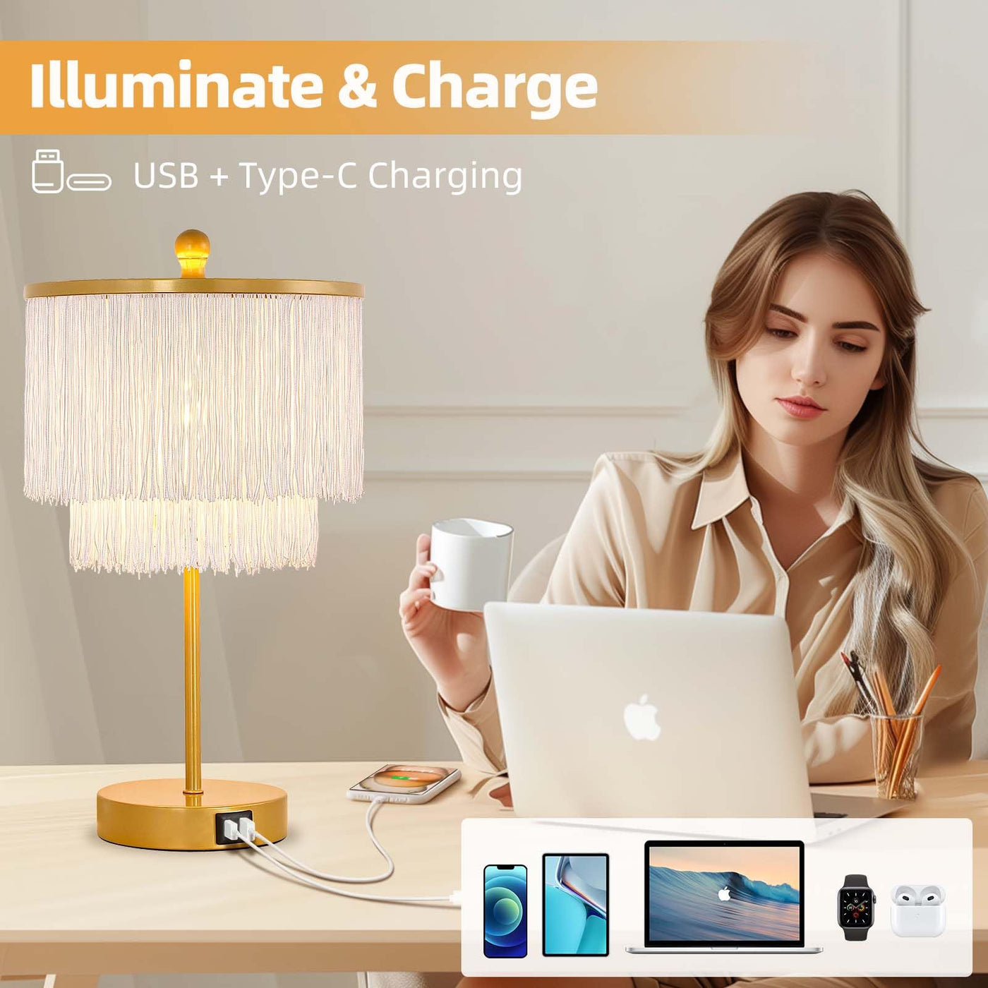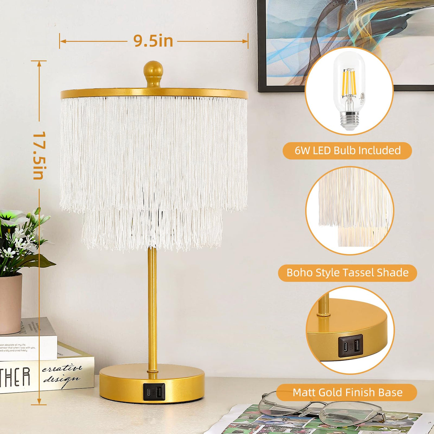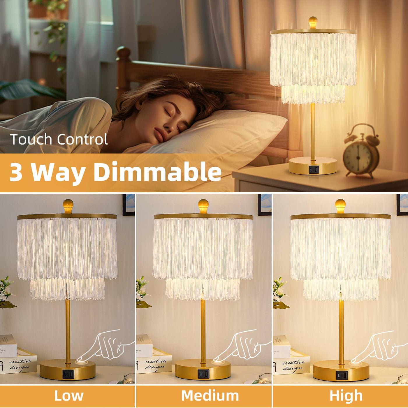 Lovlast Boho Lamp For Bedroom, 3-Way Dimmable Bedside Touch Lamp With Usb Charging Port, Gold Table Lamp, Fringe Boho Table Lamp