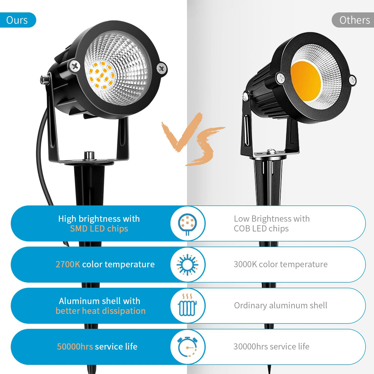 Q: What kind of illumination can I expect from these lights?A: The LED bulbs emit a warm 2700K light that provides a soft yet bright glow, perfect for illuminating pathways, gardens, and patios without being overly harsh.