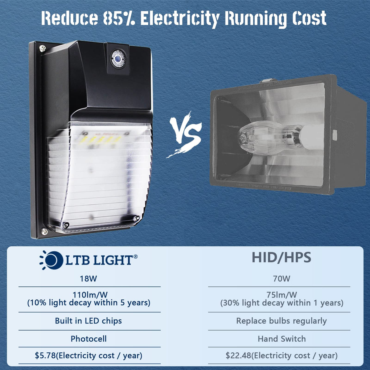 Transform your outdoor spaces with the LTBLIGHT 18W LED Wall Pack Light, expertly designed to replace traditional 60-100W HPS or HID fixtures. This energy-efficient lighting solution is ideal for a variety of applications, from residential patios to commercial warehouses. With a superior lumen output and an innovative design, it offers exceptional performance while saving you money on energy bills and maintenance costs.