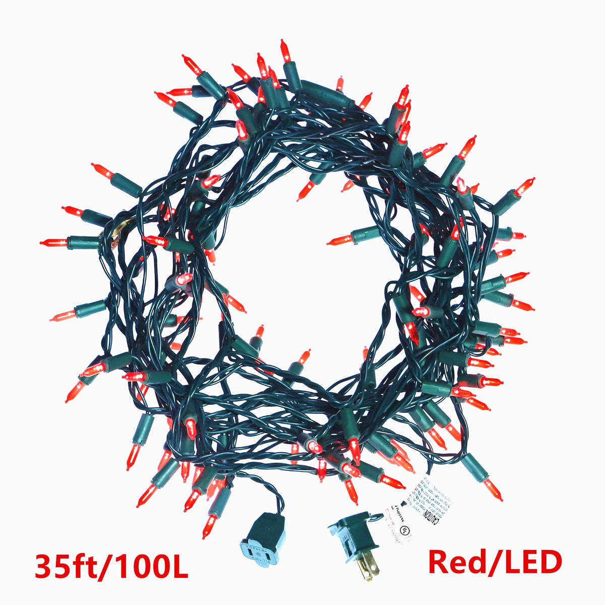 Other LEDs keep on lighted if some LEDs fall off the string lights. 100 red mini LEDs, 35 ft length and 4 inches spacing, UL listed 22# green wire and plug in, end to end connect 15 sets, AC 120 volts, 13.2 watts, 2 replacement bulbs and 1 fuse.
