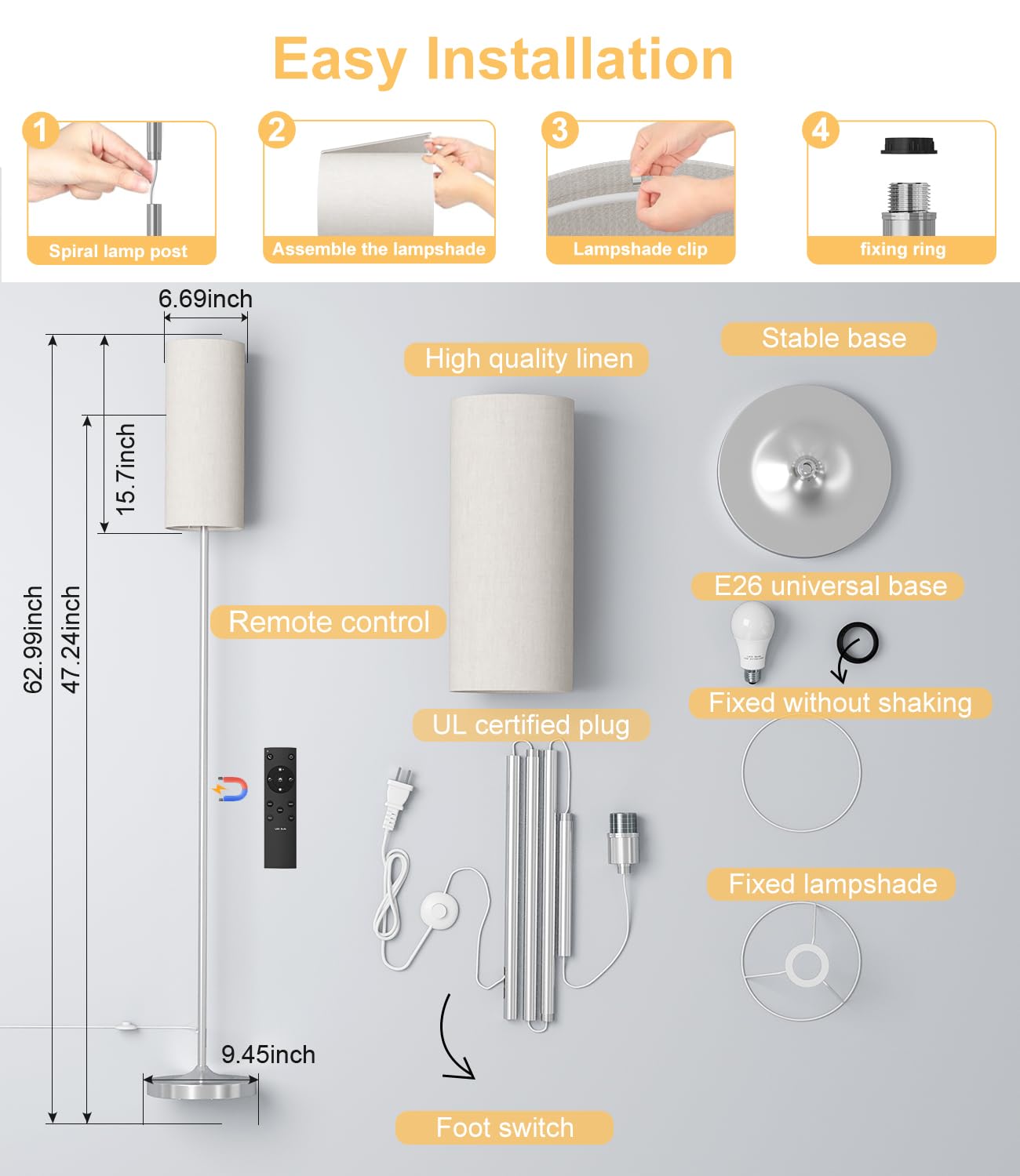 Luckystyle Led Floor Lamp For Living Room, Dimmable Standing Lamps With Foot Switch,Remote Custom Color Temperature Silver Pole