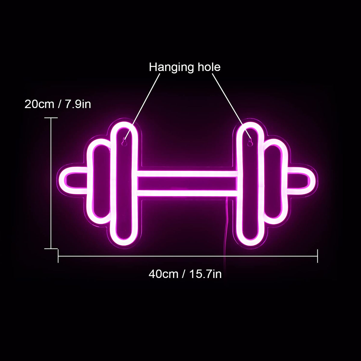 Easily Operate: Powered by a safe USB connection, the dumbbell neon light features an easy-to-use switch. It can be conveniently powered by a power bank or computer, and the two hanging hook holes allow for effortless wall display.