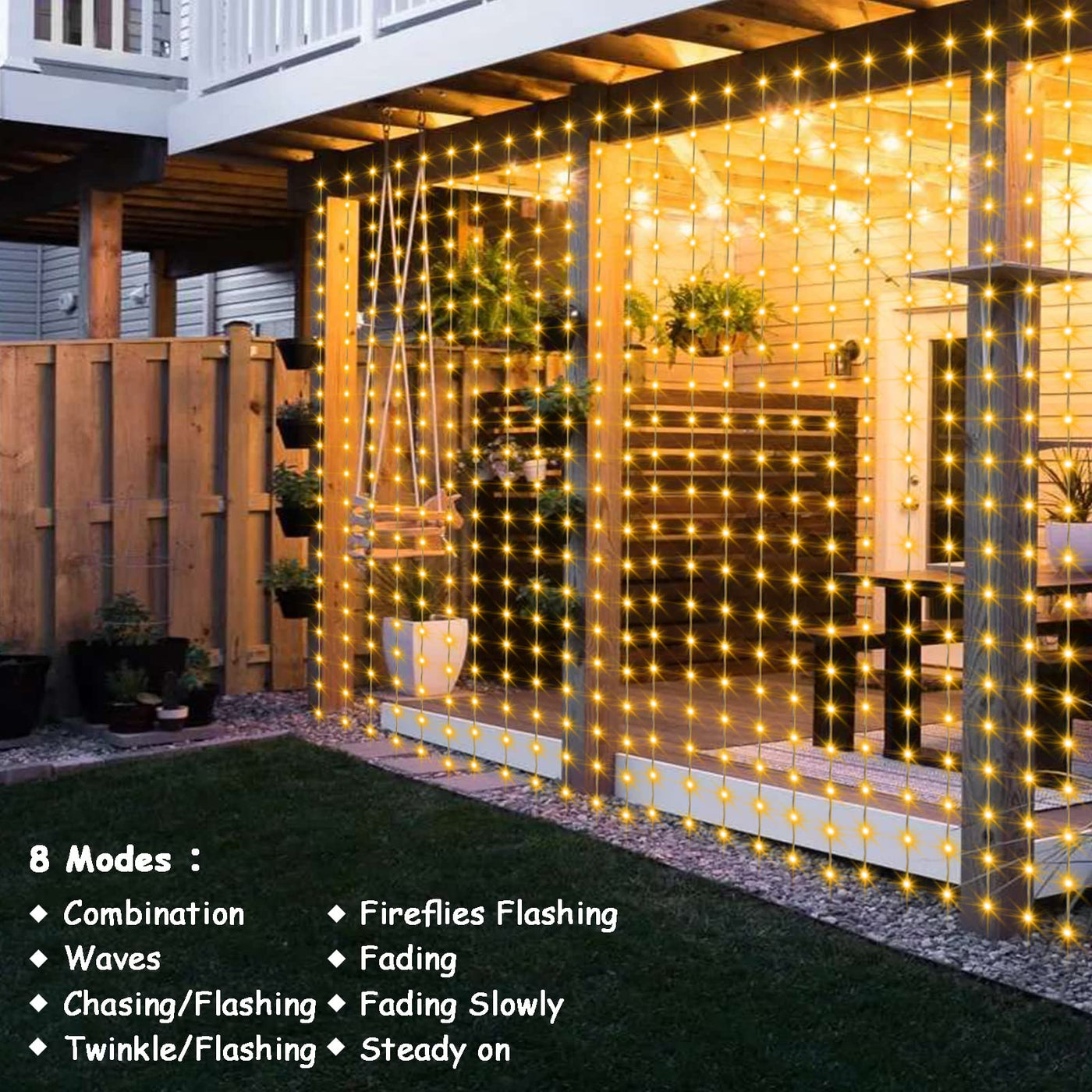 Q: Are these curtain lights waterproof for outdoor use?A: Yes, these fairy lights are IP68 waterproof, which makes them suitable for outdoor use, perfect for decorating patios, gardens, and special events like weddings.