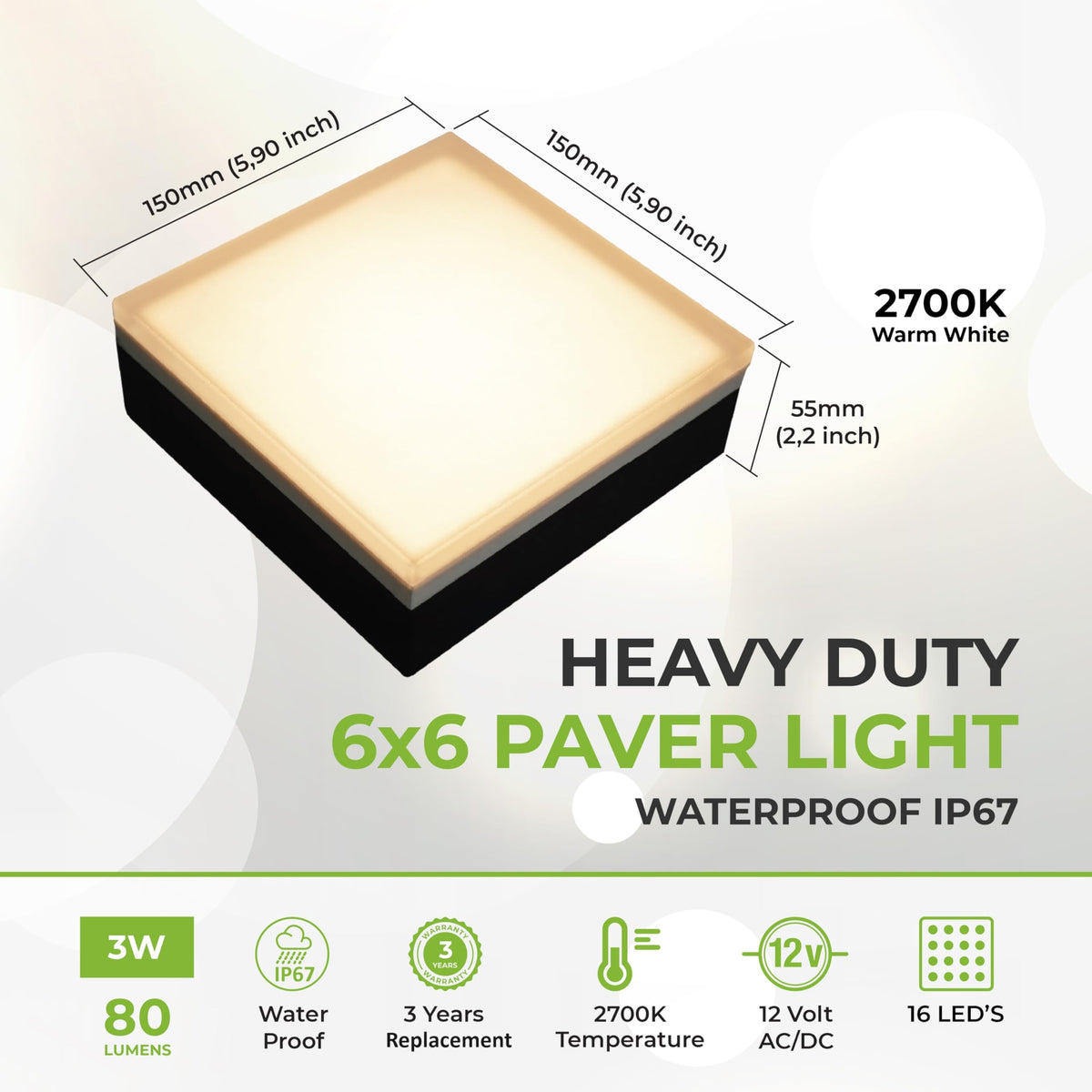 Lumengy 6X6 Paver Lighting&Nbsp; Perfect For Glowing Accents Along Driveways And Pathways Pavers Or Concrete Or Soil. Solid Stainless Steel Frame. Thick Frosted Tempered Glass Top For Maximum Durability. Replaces Standard 6'' X 6'' Pavers 6 Led'S For Better Light Spread. Waterproof Ip67 12V / 3W / 80Lm 2700K Beautiful Warm White 3 Years Warranty Product Descriptions:Wattage: 3 Wattslumens: 80Color Temperature: (K)2700Voltage: 12V Ac/Dclight Source: Ledwater-Resistant Rating: Ip67Warranty: 3 Years(Under Regular Working Conditions)Package Included: 1 Stainless Steel Pavers-Light Fixture With 6 Feet Low Voltage Lead Wire. *This Product Requires A Non-Dimmable 12V Ac/Dc Transformer (Not Included)&Nbsp;