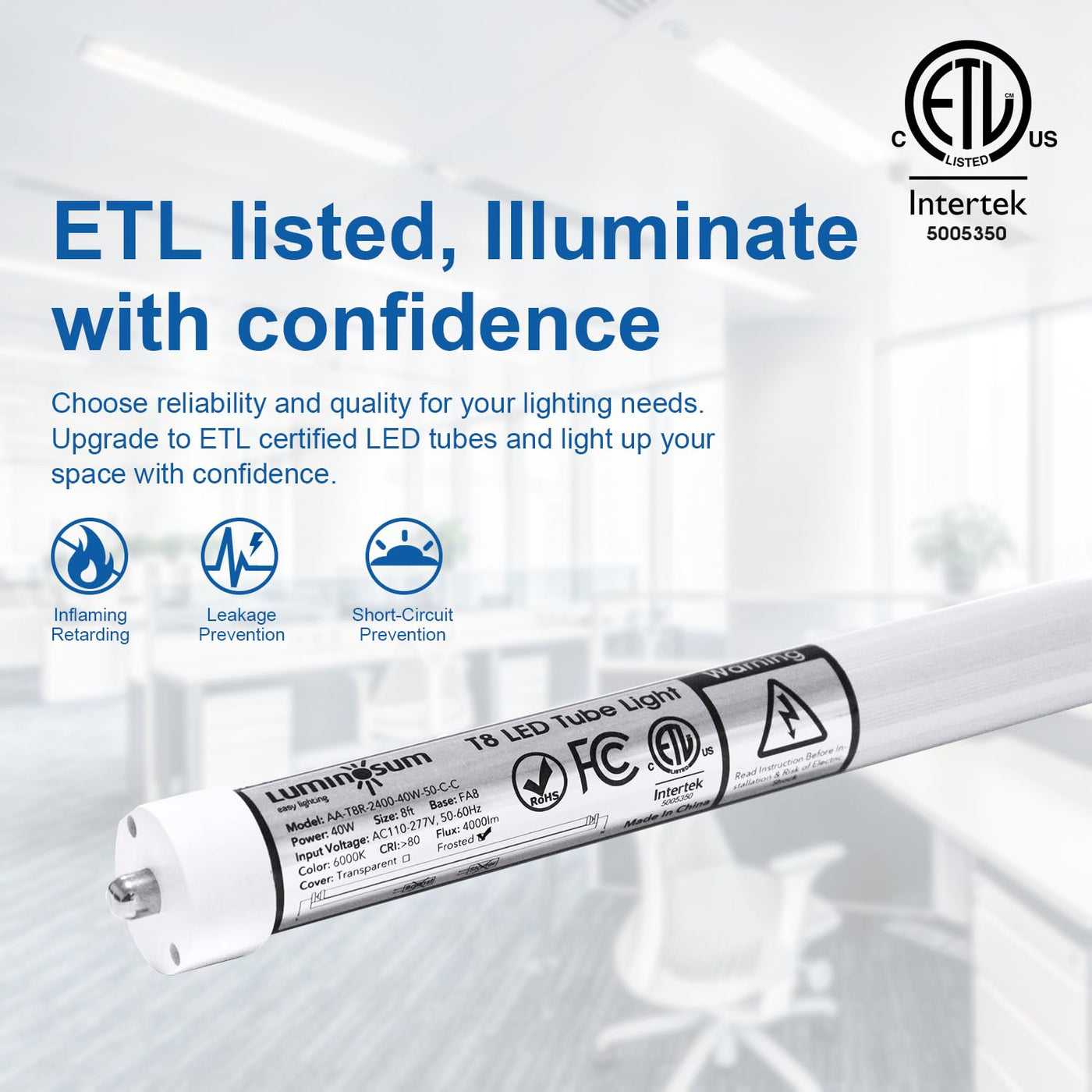 Upgrade your lighting system with the LUMINOSUM 8ft LED Tube Lights, designed for efficiency and performance. With an impressive output of 3800 lumens, these energy-saving tubes not only illuminate your space but also help reduce your electricity bill by up to 50% compared to traditional fluorescent tubes. Built to last, the LUMINOSUM LED tubes boast a lifespan of over 50,000 hours and are ETL certified for safety. The dual-end powered design simplifies installation, making them compatible with T8, T10, and T12 fixtures through a straightforward ballast bypass (direct wire) process.