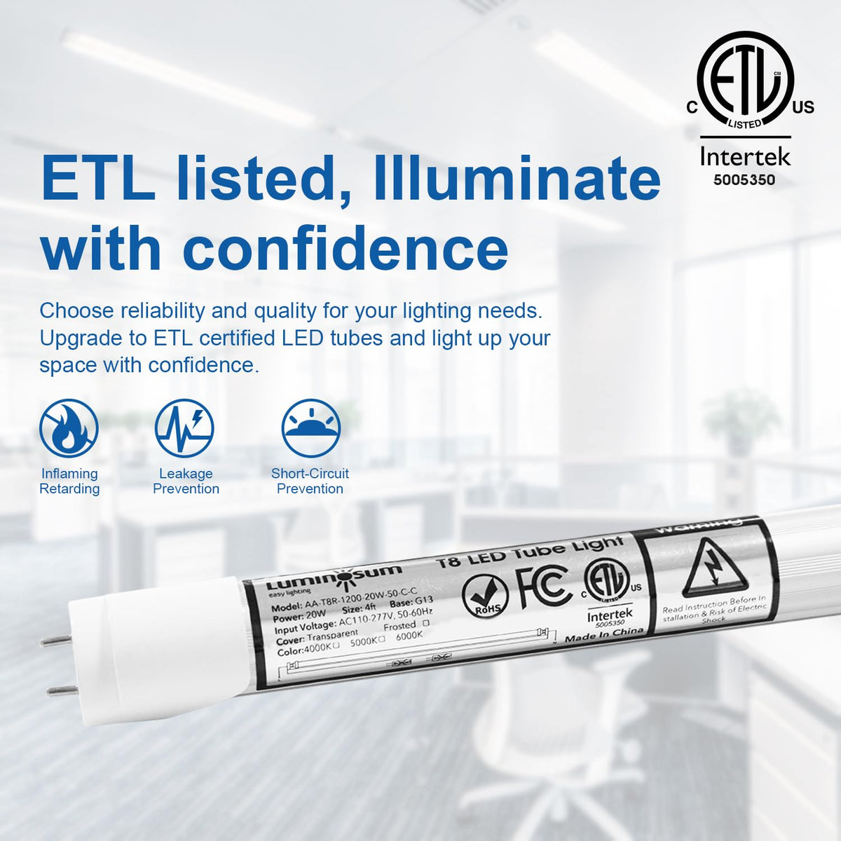 LUMINOSUM is a new brand that develops and supplys high quality LED light bulbs and novelty LED products. You are brilliant for making the decision to replace the fluorescent tubes with energy efficient LED tube lights. LUMINOSUM T8 LED tube light is only 20W and as bright as 40W fluorescent tube, so you can easily save more than 50% at your electricity bill. T8 LED tube light 4ft is fitted with the traditional fluorescent tube holder. The installation is easy, just remember to remove the ballast and starter. With ETL certified and double-end powered designed, safety usage is highly guaranteed. Specification Power: 20W Tube Type: T8 Length: 4 feet (1.2m) LED Chip: SMD2835 LED qty: 96 Lumens: 2200lm Voltage: AC85-265V Power Drive: Constant Current Rendering Index: >80 Color Temperature: Daylight 5500-6000k Material: Aluminum+PC Certification: CE,RoHS,ETL Warranty: 2 Years Package includes 25 x LED tube lights