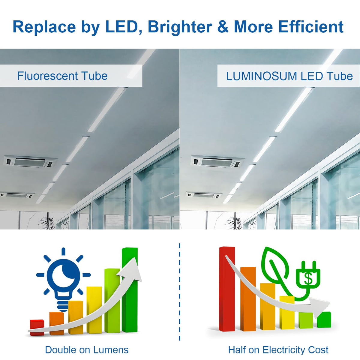 ?Energy Saving - Save up to 50% on your electricity bill when replacing fluorescent tubes by LUMINOSUM 4ft LED tube lights. | ?Bright & High Illumination - Illuminate your space with 2000+ lumens! No annoying flicker and distracting buzz. Energy efficient and environmental friendly. | ?Safe and Long-lasing - With ETL certified, LUMINOSUM LED tubes are safe to use and have a long lifetime of 50,000+ hours. | ?Easy Ballast Bypass Installation - LUMINOSUM 4ft LED tubes are compatible with T8, T10, T12 fluorescent fixtures, just requiring a simple ballast bypass (direct wire) installation.Please watch the video or download the user manual for detailed installation instruction. | ?Your Trusted LED Tube Bulk Supplier - Count on us as your reliable partner for all your bulk LED tube needs, delivering lasting brightness and energy efficiency.