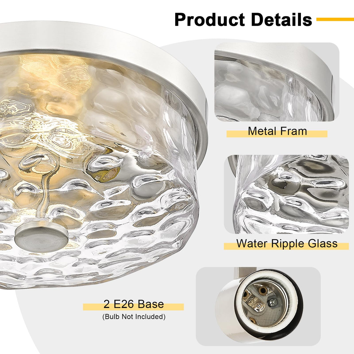 Q: What type of bulbs can I use with this ceiling light fixture?A: This ceiling light is compatible with E26 base bulbs and can accommodate up to 2 pieces of Max 60W bulbs. It works well with incandescent, LED, CFL, and halogen bulbs.