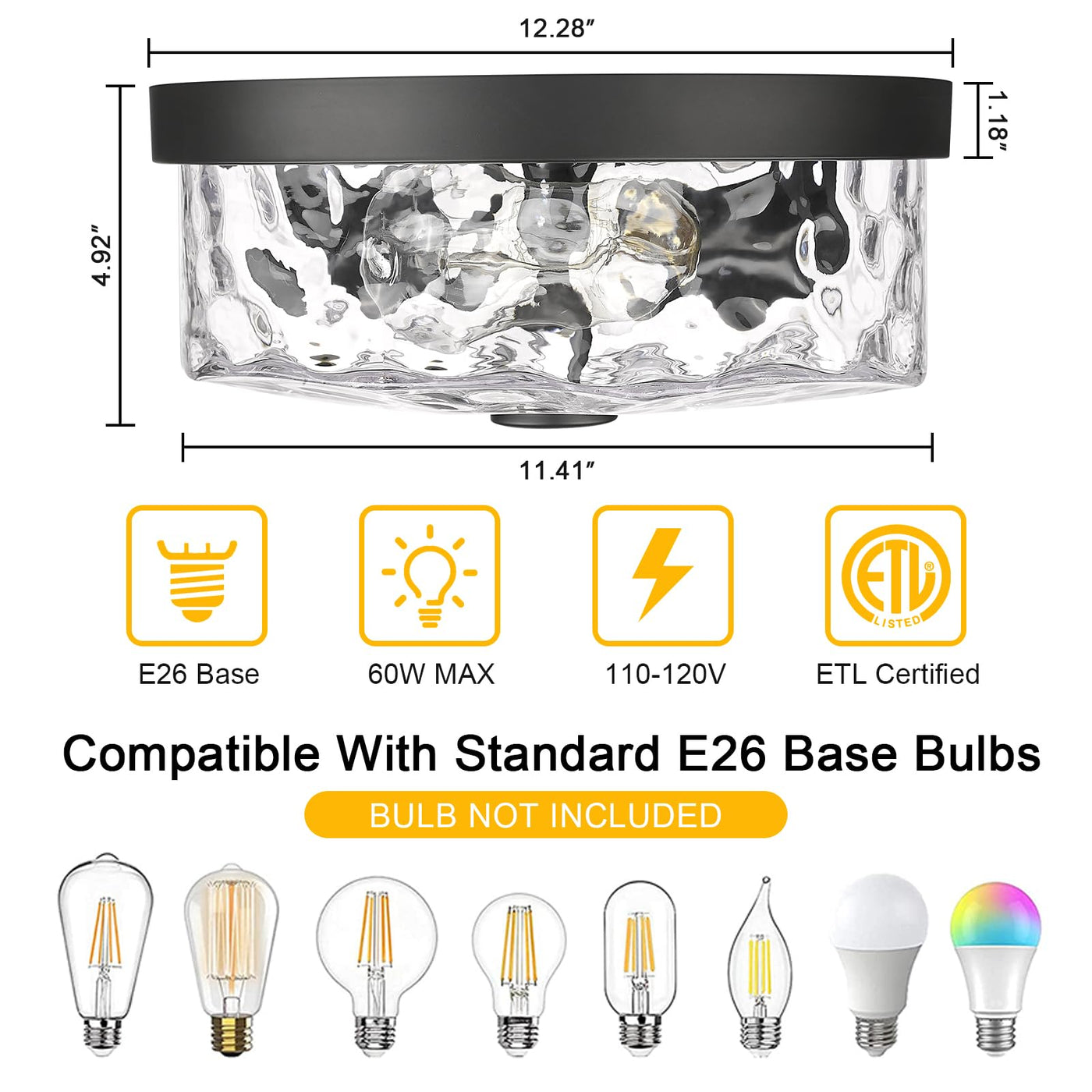 Q: What type of bulbs are compatible with the Luminzone Flush Mount Ceiling Light?A: The Luminzone Flush Mount Ceiling Light is compatible with E26 base bulbs, including incandescent, LED, CFL, and halogen options. It requires 2 bulbs, each with a maximum wattage of 60W.