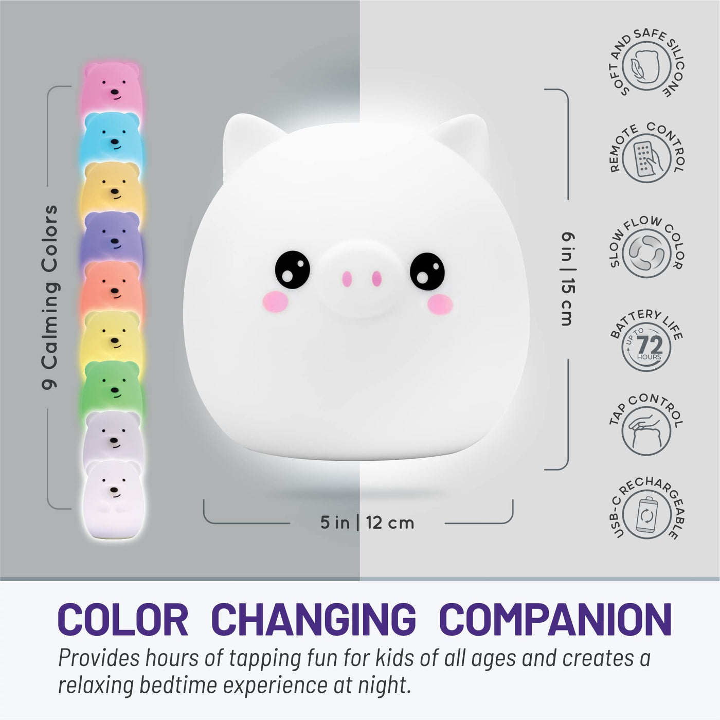 Lumipets Kawaii Pig Night Light, Silicone Rubber Material, Multicolor, Usb Rechargeable, Remote Control, 12 Hour Battery Life, 60 Minute Auto-Shutoff Timer, Great For Kids Bedrooms