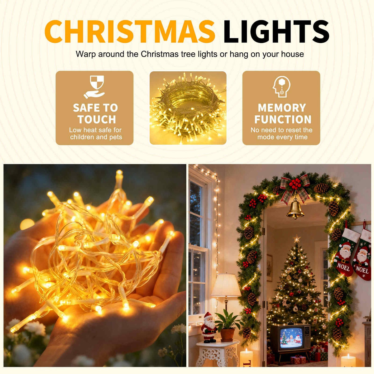 Q: What types of events are suitable for using these Christmas lights?A: These lights are perfect for events such as Christmas, weddings, birthdays, and parties, providing a warm and festive atmosphere.