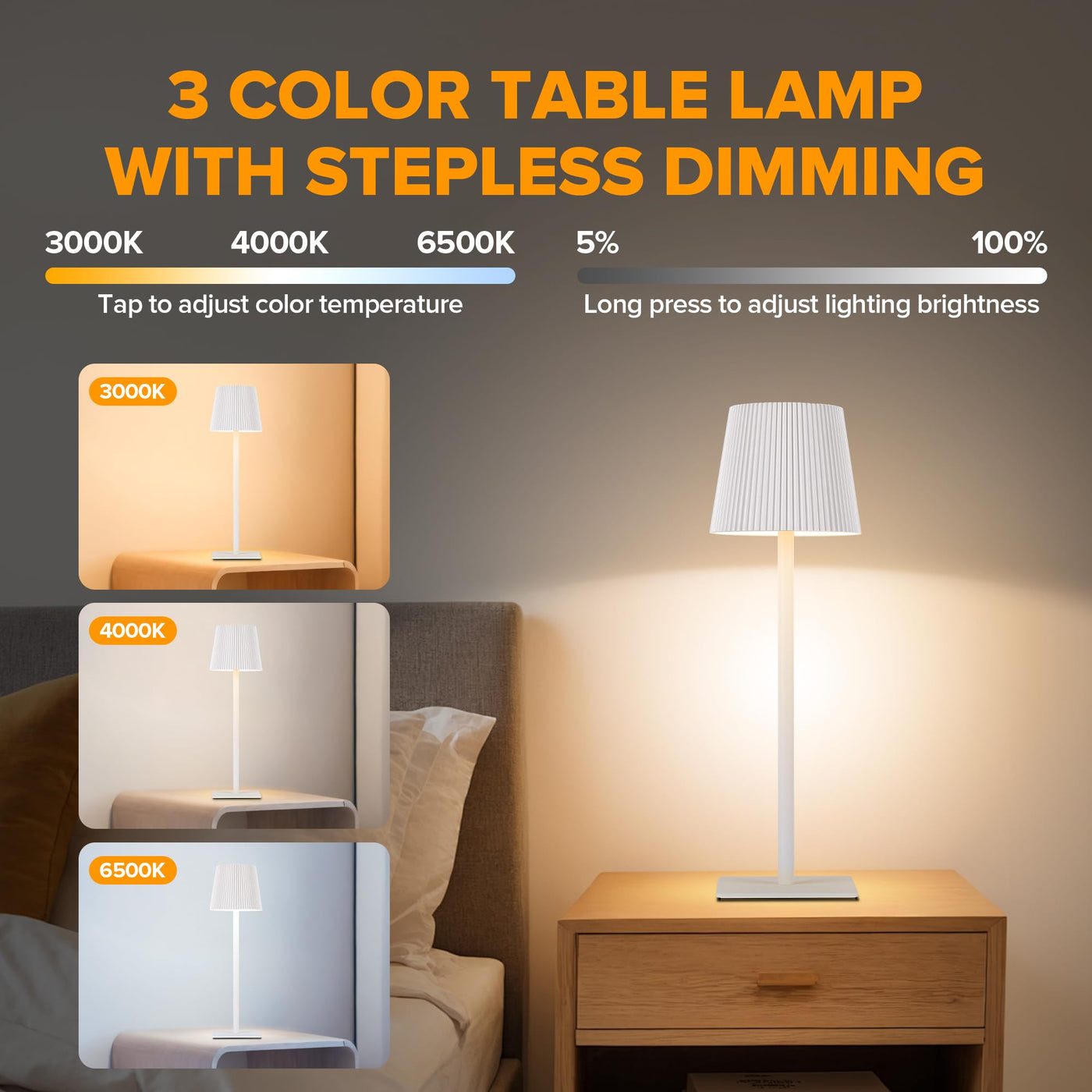 Q: What are the lighting modes available for the LUTEC cordless table lamp?A: The LUTEC cordless table lamp offers three lighting modes: warm light (3000K) for a cozy ambiance, natural light (4000K) for everyday tasks, and white light (6500K) for high-visibility needs. You can also adjust the brightness steplessly from 10% to 100%.