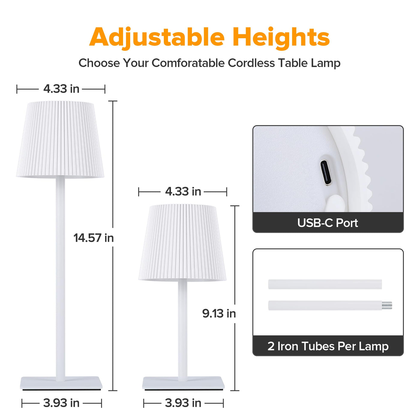 Q: Can the height of the lamp be adjusted?A: Yes, the LUTEC cordless table lamp can be assembled in two adjustable heights: 9.13 inches and 14.57 inches, making it versatile for various settings, from outdoor events to cozy bedrooms.