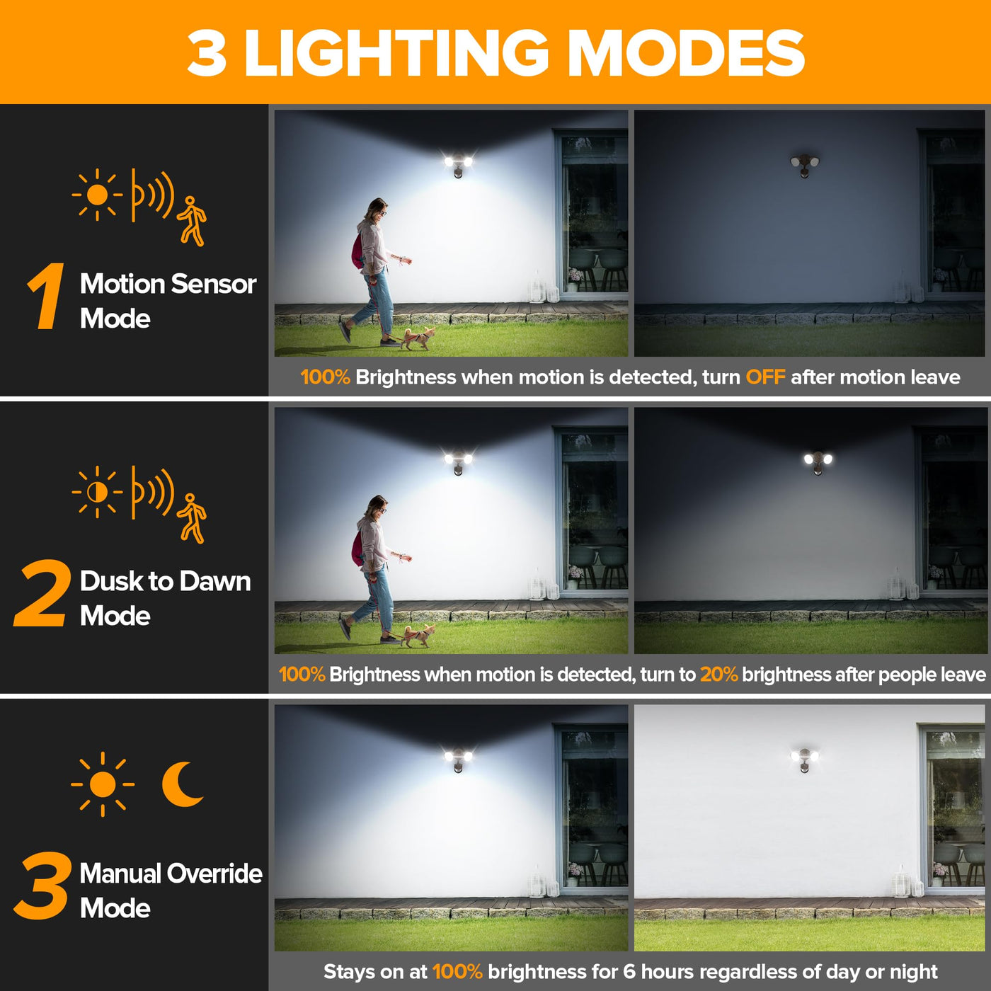 Q: What are the different lighting modes available on this security light?A: This security light features four lighting modes: Test Mode, Security Mode, Dusk to Dawn Mode, and Manual Override Mode. The Manual Override Mode allows the light to operate continuously for a selected period, providing versatility for various needs.