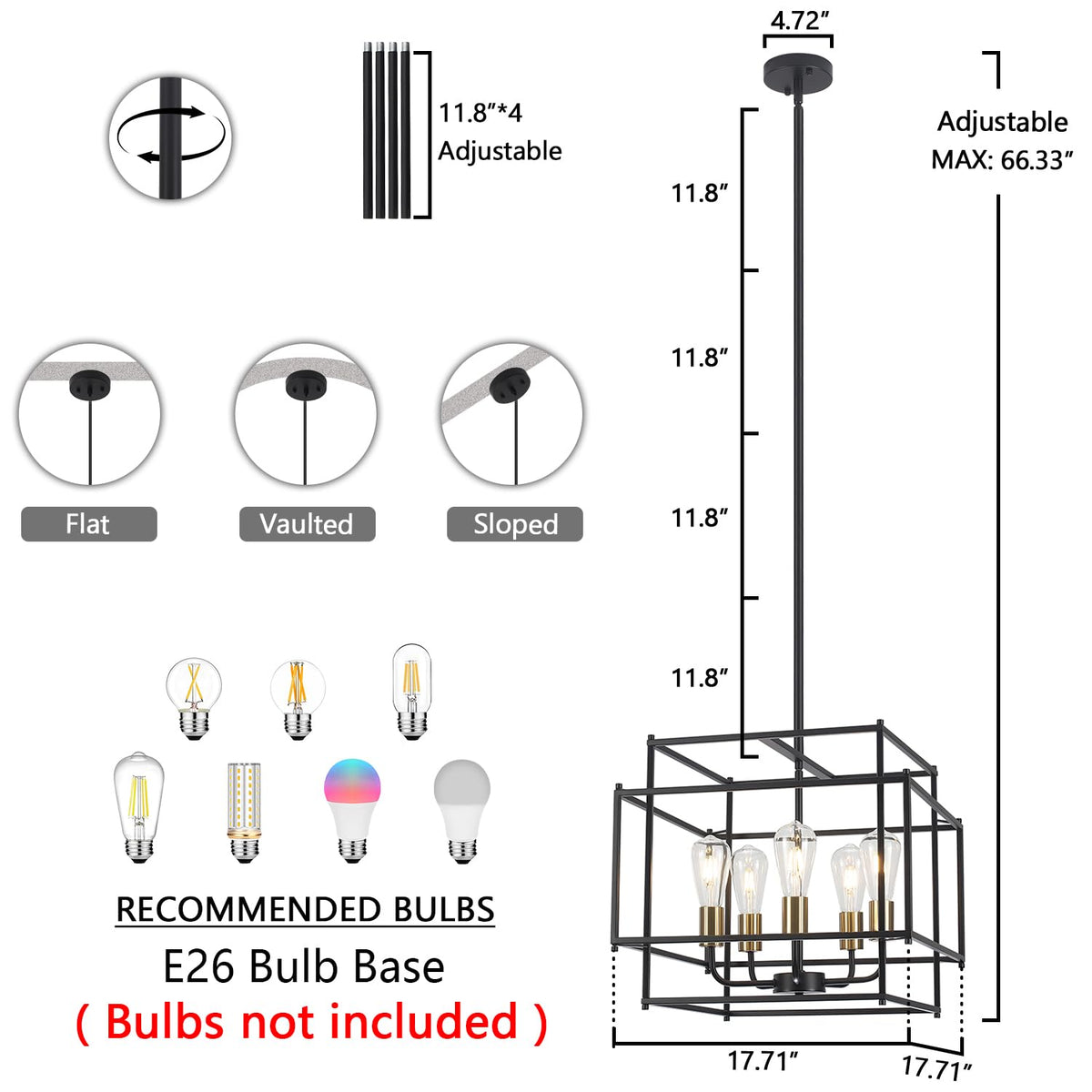 Q: What type of bulbs are compatible with the Luupyia 5Lights Rectangle Chandelier?A: The Luupyia 5Lights Rectangle Chandelier is compatible with E26 base bulbs, including LED, Incandescent, Compact Fluorescent, and Halogen bulbs. For dimming capabilities, ensure you use a compatible dimmer switch and dimmable bulbs.