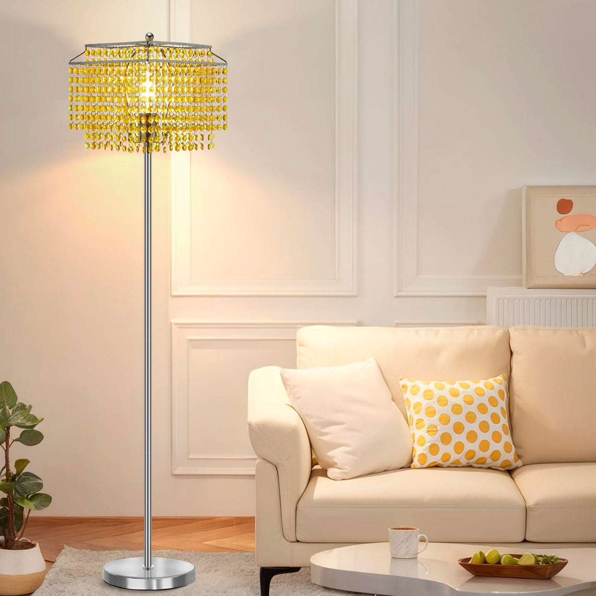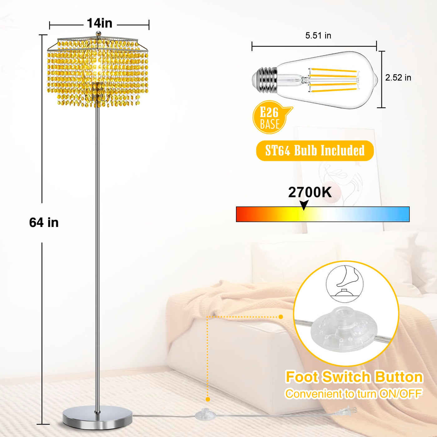 Crystal Floor Lamp, 64'' Tall Elegant Standing Lamp With On-Off Foot Switch, Double-Layer Lampshade, Yellow Standing Lamps For Living Room, Bedroom, Office, 8W Bulb Included