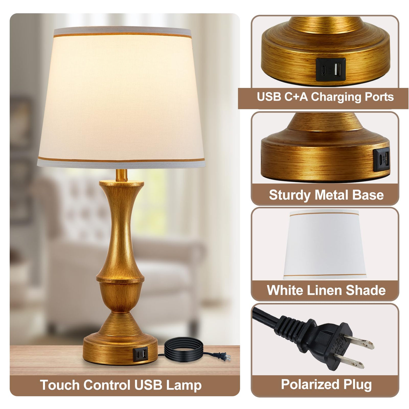 Luvkczc Gold Touch Table Lamps Set Of 2, 22'' Bedside Lamps With Usb C+A Ports, 3 Way Dimmable Nightstand Lamps With White Lamps