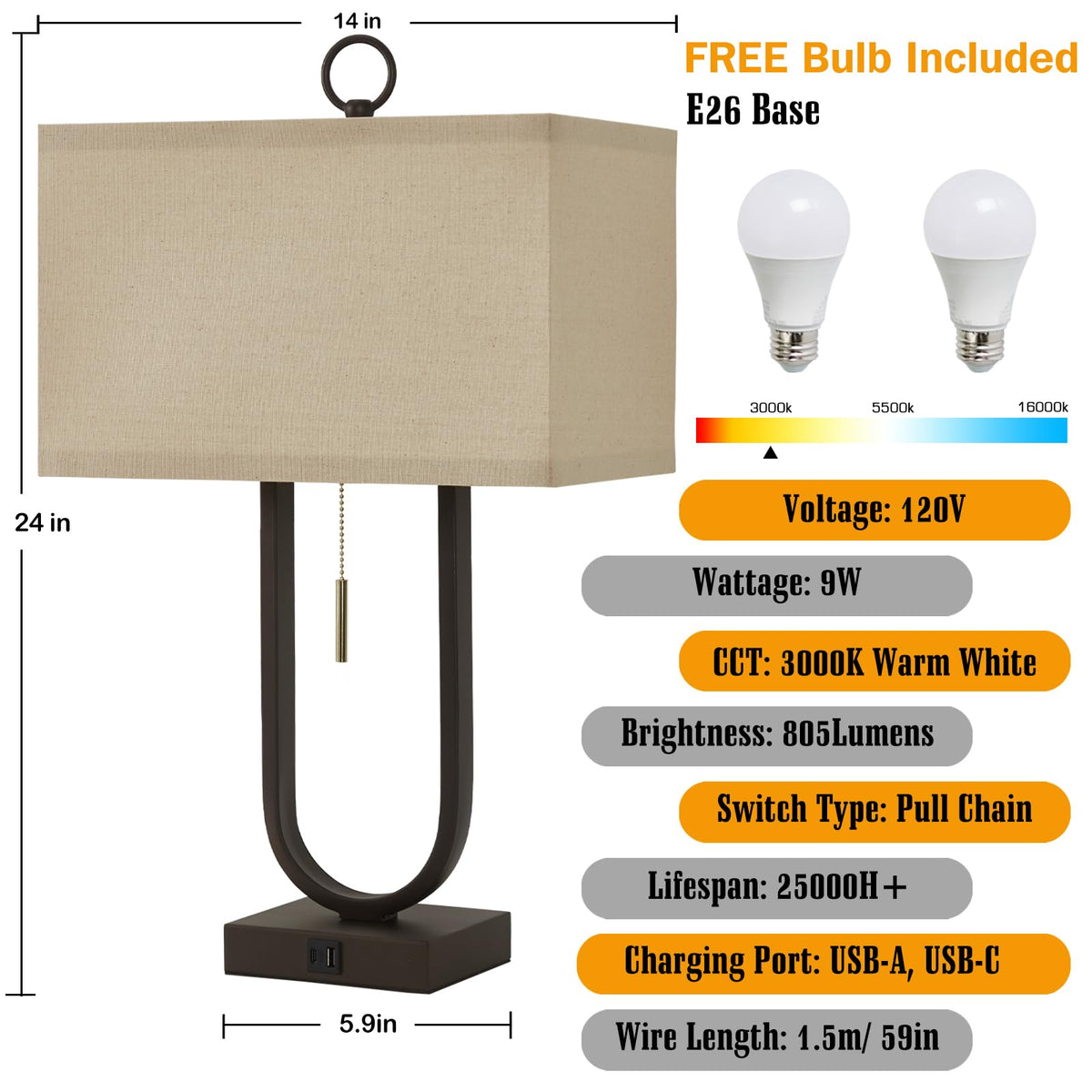 ? Prioritizes Durability and Safety?Our Tall Table lamps use heavy-duty metal base and an anti-skid pad, they offer enhanced stability and prevent shaking.The thickened pole makes the lamp more stable and durable,Heavy base design provides added safety, making our lamps for bedroom perfect for households with children or pets. easy to fit in most decor for modern, classic, rustic, industrial. We specially add some weight in night lamp base to avoid knocking the lamp off by children or pets. | ?Upgraded USB-C & USB-A Charging Ports? The Bedside lamp off fast USB-C port and a USB port (5V/2.1A) charging ports, you can easily and quickly charge two electronic devices simultaneously,Whatever Lamps on or off,easy charge your mobile phones, iPads, Kindles, headsets, diffusers, speakers, and other electronics with ease. | ?2 Free LED Bulb Included? No need to buy bulbs separately, we are equipped with two 9W A19 LED bulb. The 3000K warm white bulb matches with the linen fabric lampshade to create a special warm and romantic atmosphere. Equal to 60W incandescent bulb, saving up to 90% on your energy bill. Gives soft and natural light, No flicker, no dazzle, better protect your eyes | ?Easy to Assemble and Pull Chain Design?Pulling chain easily to control the light on and off. The contemporary living room lamp is designed with the distinctively modern appearance, so simple but unique, adding an elegant decor to your place. What’s more, the bedroom lamp is super easy to get it together by 3 steps, you need to support the linen shades by 2 coming with metal rings at first, then the pole, bulbs will be the last step. | ?3 Year Warranty & 24Hrs Service? We proudly stand behind all of our products 100% and offer a full 3-year warranty. You can bring one back home at the first time and we are confident that you will get more. Live chat service is 24hrs online, so you can send our amazon box at any time.