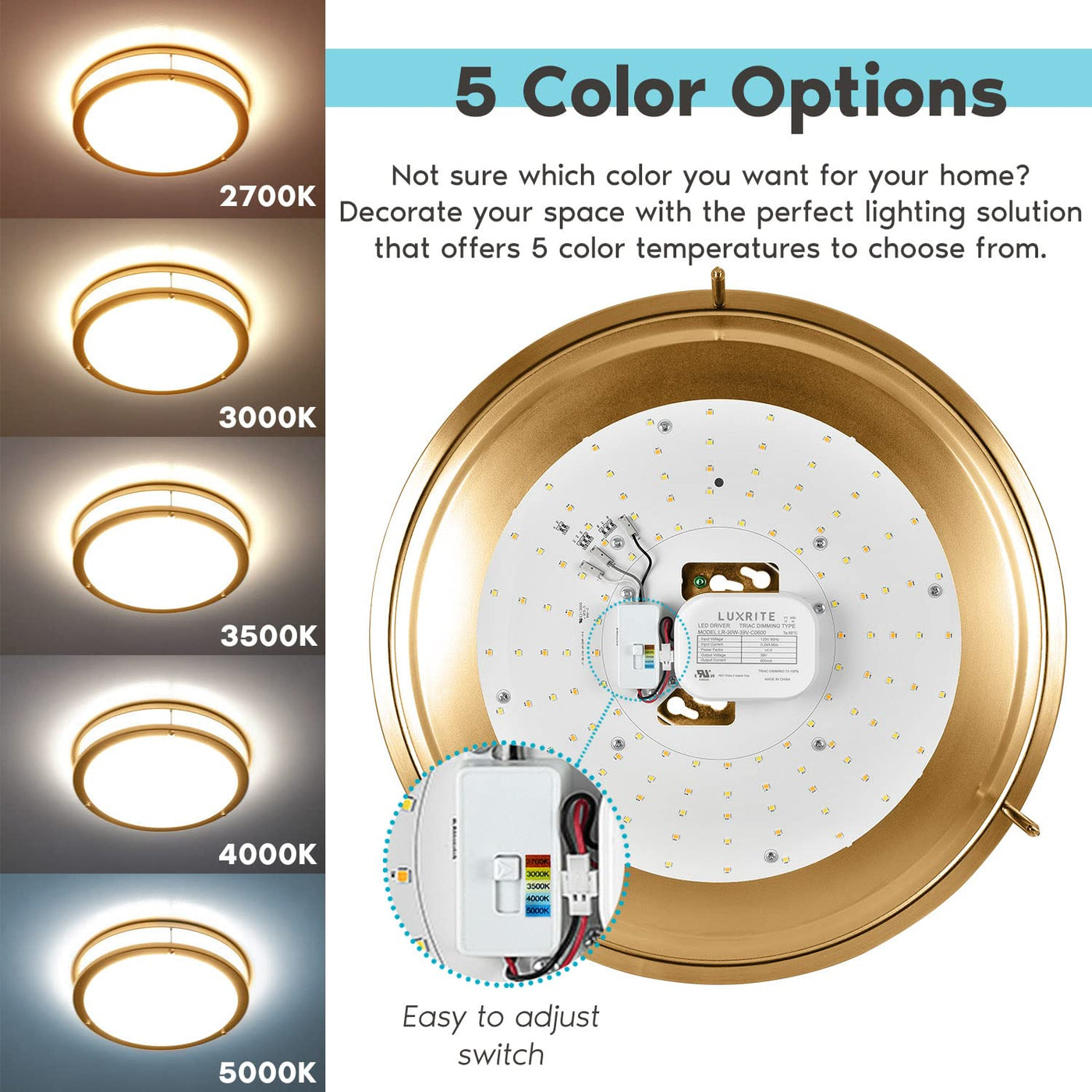 The Luxrite Ceiling Light Fixture is designed to provide versatile lighting solutions for both home and business environments. With a unique 5-color temperature switch, this flush mount LED ceiling light allows users to select the perfect lighting ambiance for any setting.