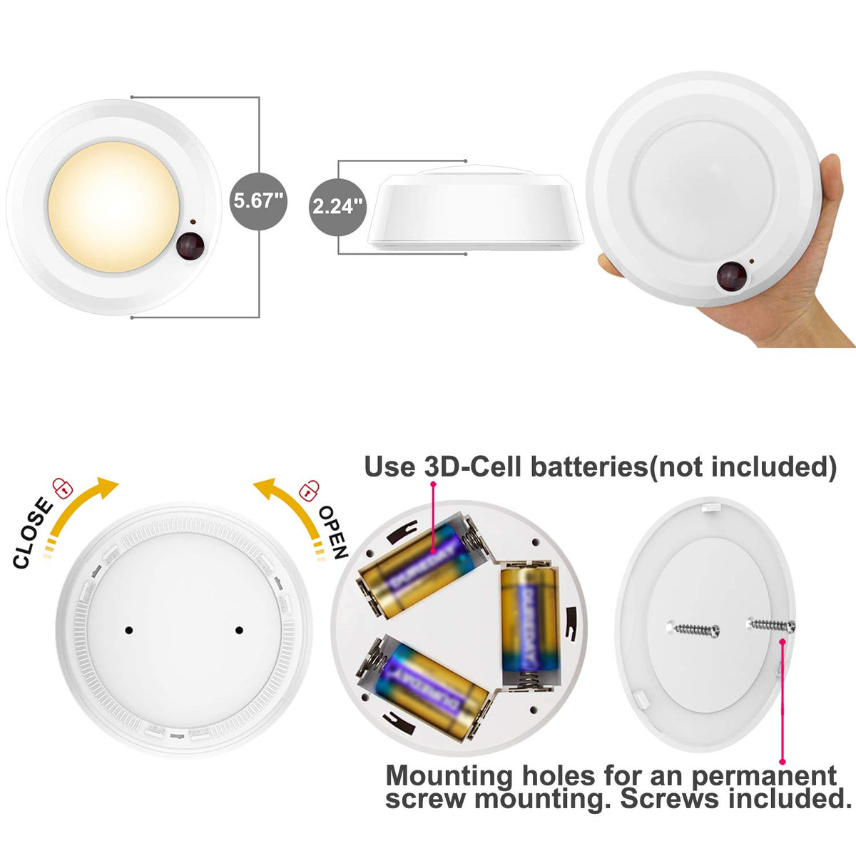 Q: What are the dimensions of the LUXSWAY Battery Operated Ceiling Light?A: The LUXSWAY Battery Operated Ceiling Light measures five point six inches in diameter.