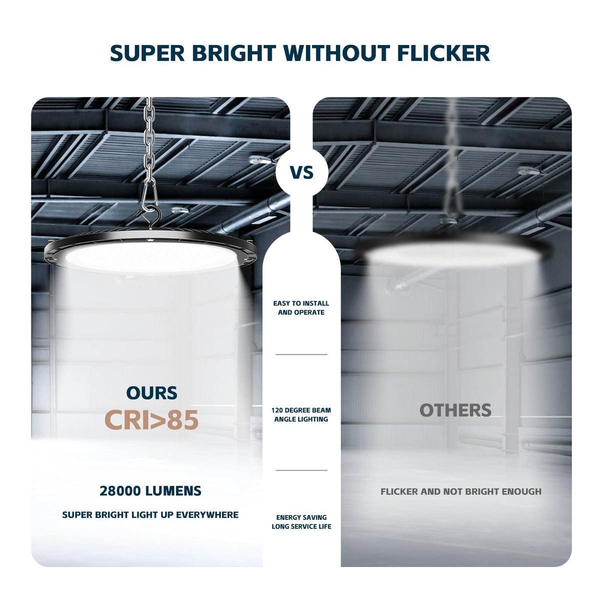 Q: How does the brightness of the LVSDAK High Bay Lights compare to traditional lighting?A: The LVSDAK UFO LED High Bay Lights provide an impressive 28,000 lumens of brightness, making them significantly brighter than traditional lighting solutions. With a higher color rendering index (CRI > 85) and a daylight 5000K color temperature, these lights enhance visibility and clarity in large spaces, making them ideal for commercial use.