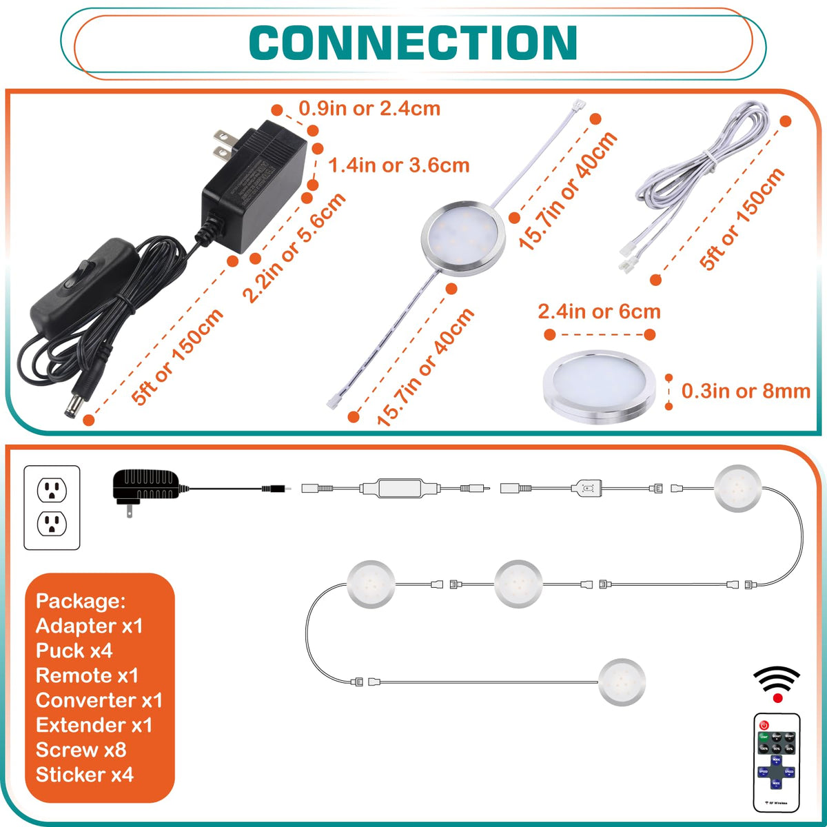 ? Package Included: 4 * Linkable LED puck light 4 * Strong adhesive sticky tapes 8 * Installation screw 1 * 5ft long extension cable 1 * UL listed power adapter wall plug (110v 120v AC input, 12V DC output) 1 * Wireless RF LED remote controller 1 * Warranty card