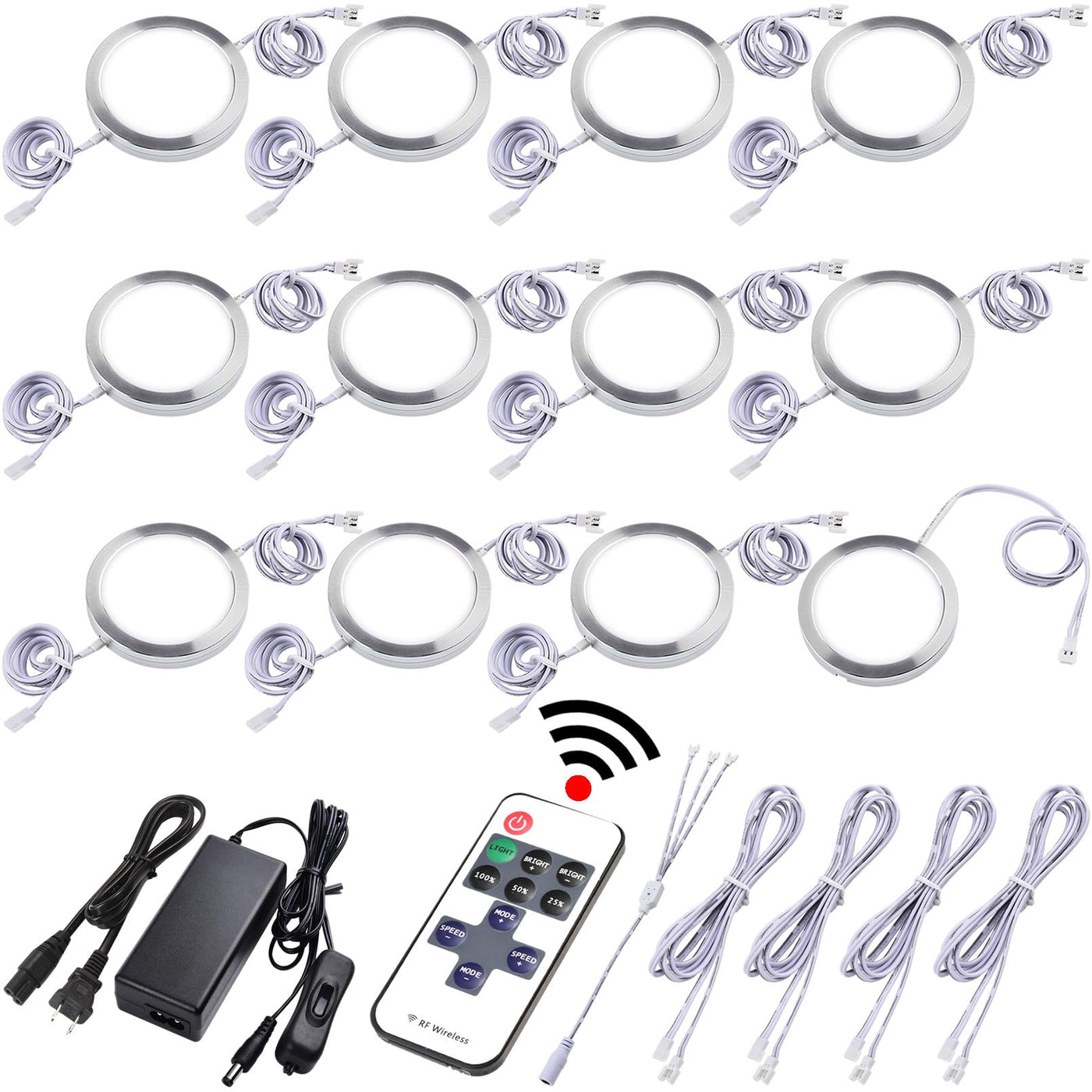 Lvyinyin Small Led Puck Lights For Uplight Or Downlight, 120V Hardwired & Plug In Cabinet Lights Kit, Wireless Rf Remote Control Dimmable, Daisy Chained Linkable, White Wires, Daylight, 12 Lights