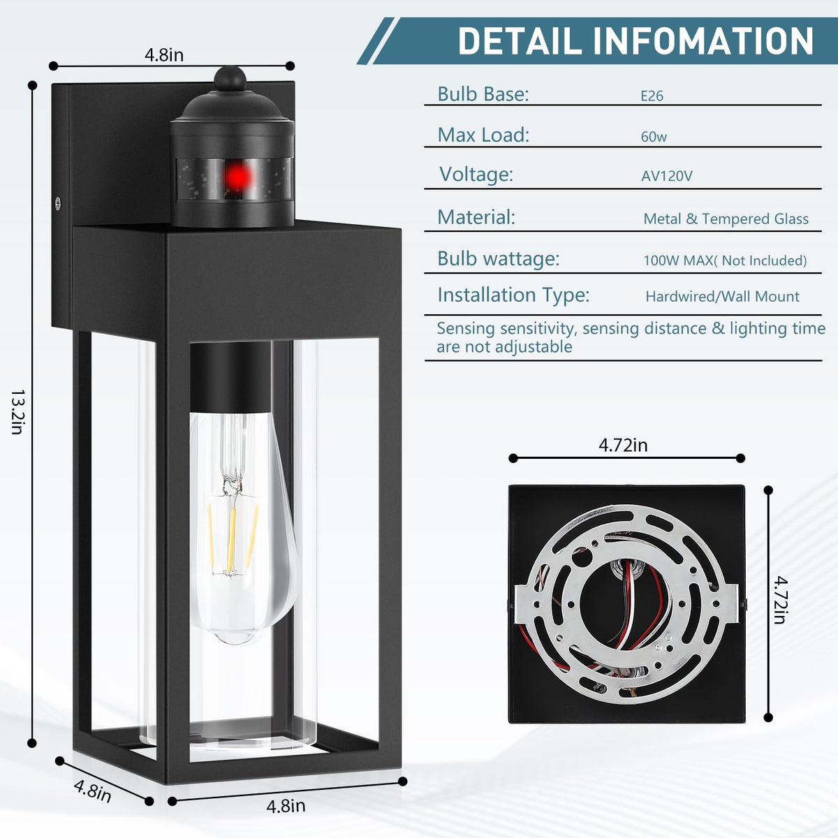 Q: What is the recommended bulb type for these motion sensor outdoor lights?A: These outdoor wall lanterns are compatible with E26 base bulbs up to a maximum of 60 watts. You can choose LED or incandescent bulbs based on your preference for brightness and energy efficiency.