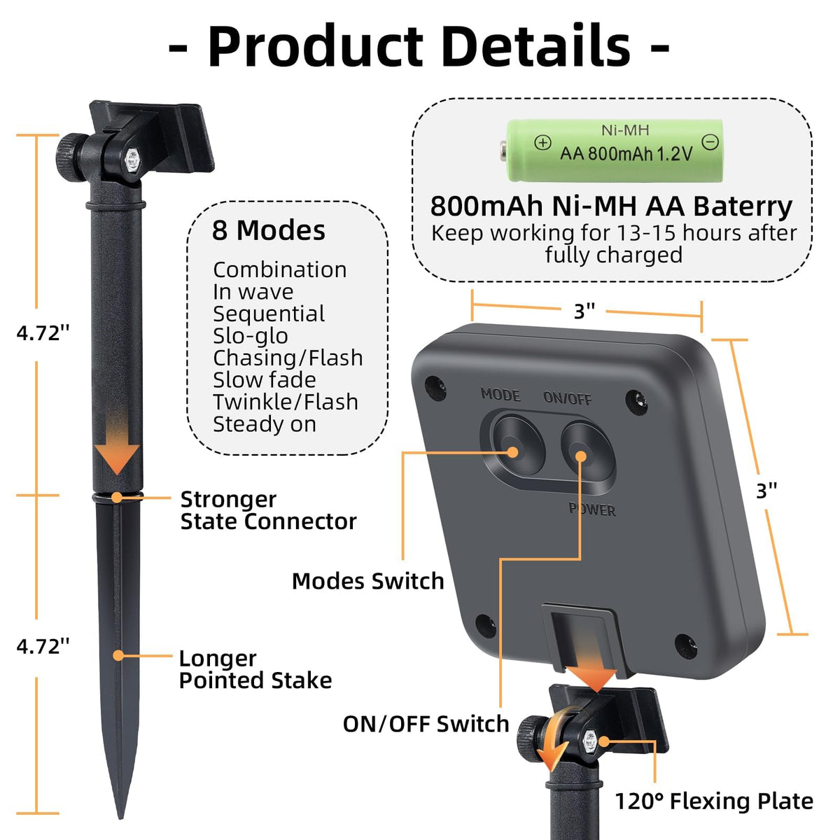 Q: What are the lighting modes available for these solar lights?A: These solar lights feature eight different lighting modes, allowing you to create various atmospheres for different occasions.