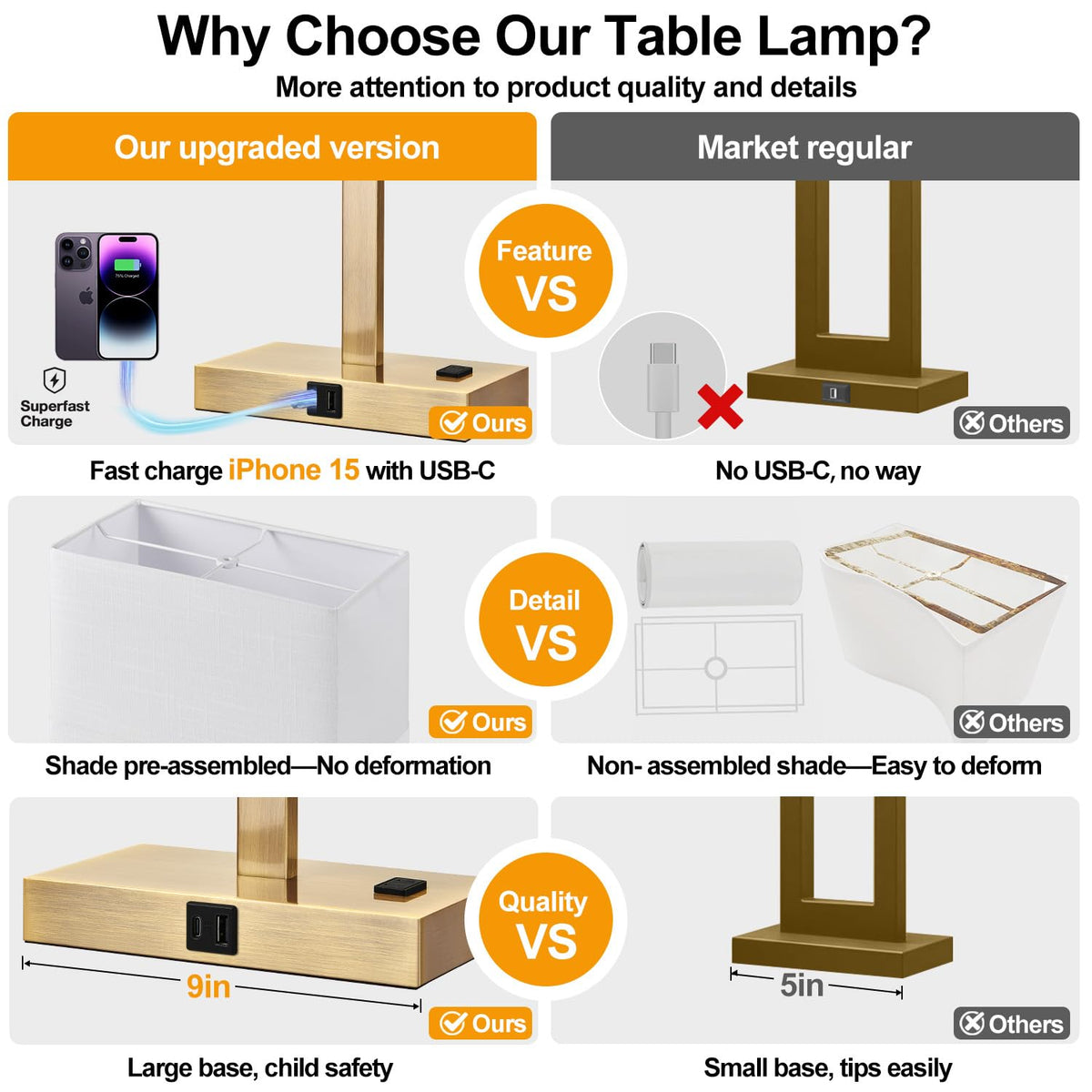 Q: What are the main features of the Lynnoland 21" Bedside Lamps?A: The Lynnoland 21" Bedside Lamps feature three levels of brightness with touch control, USB A and C charging ports, an AC outlet, and include two energy-saving 2700K LED bulbs. They are designed for safety with a weighted base and non-slip mat, making them ideal for homes with children and pets.
