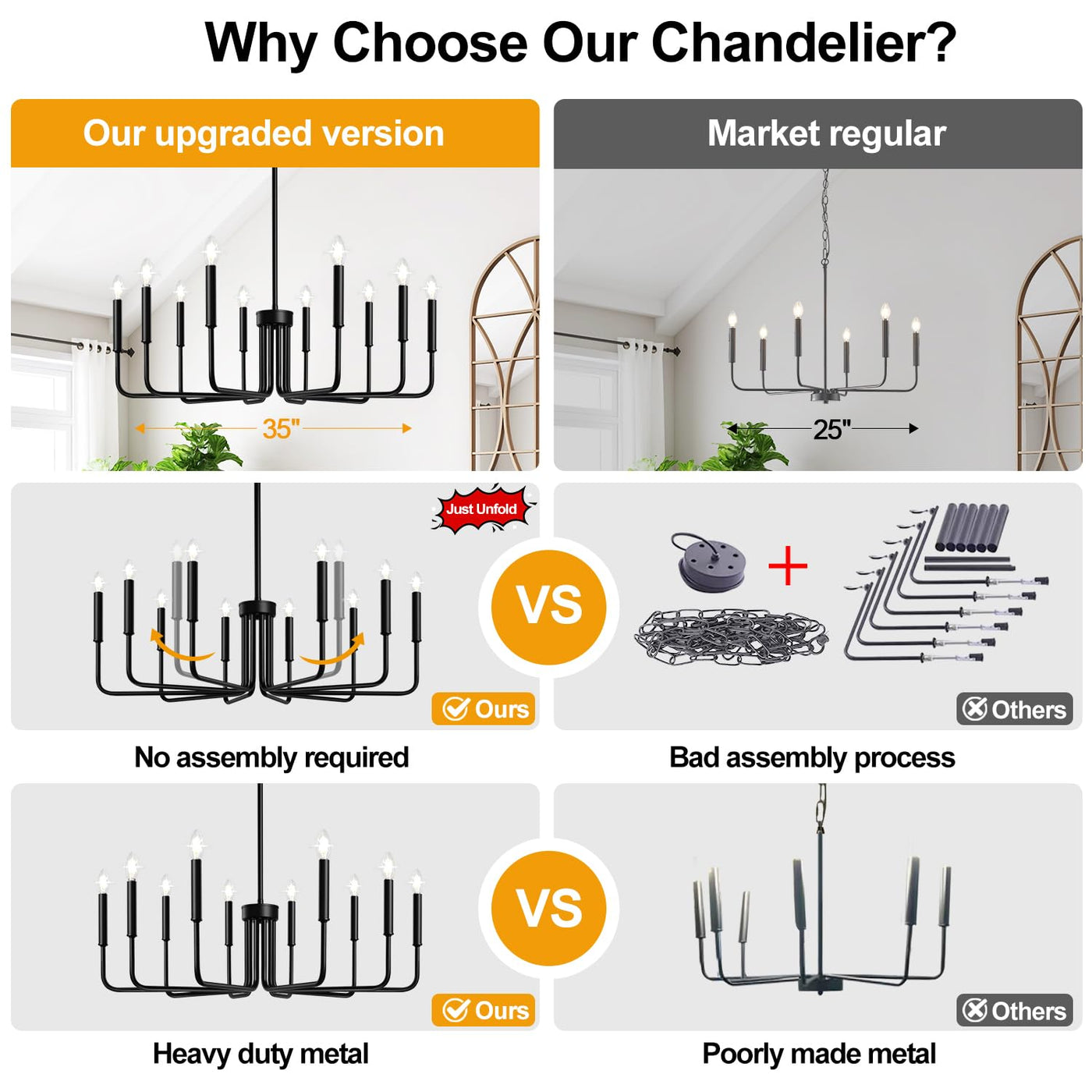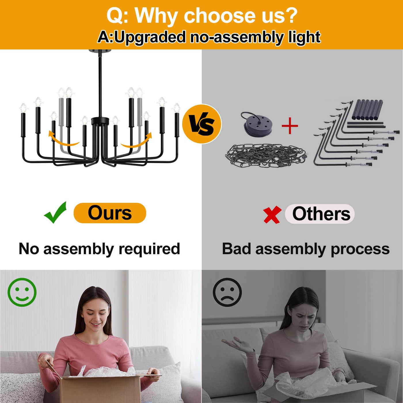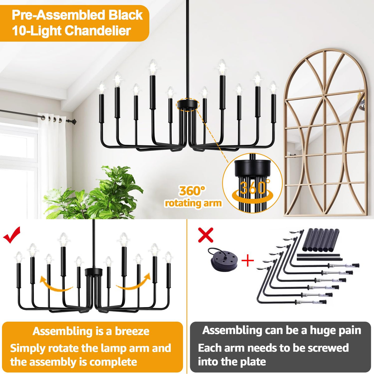 Q: Is assembly required for this chandelier?A: No assembly is required for the lamp arms, as they come pre-assembled. You only need to unfold the gathered lamp arms to complete the assembly, making it easy and hassle-free.