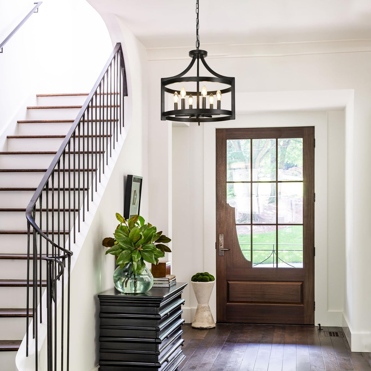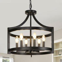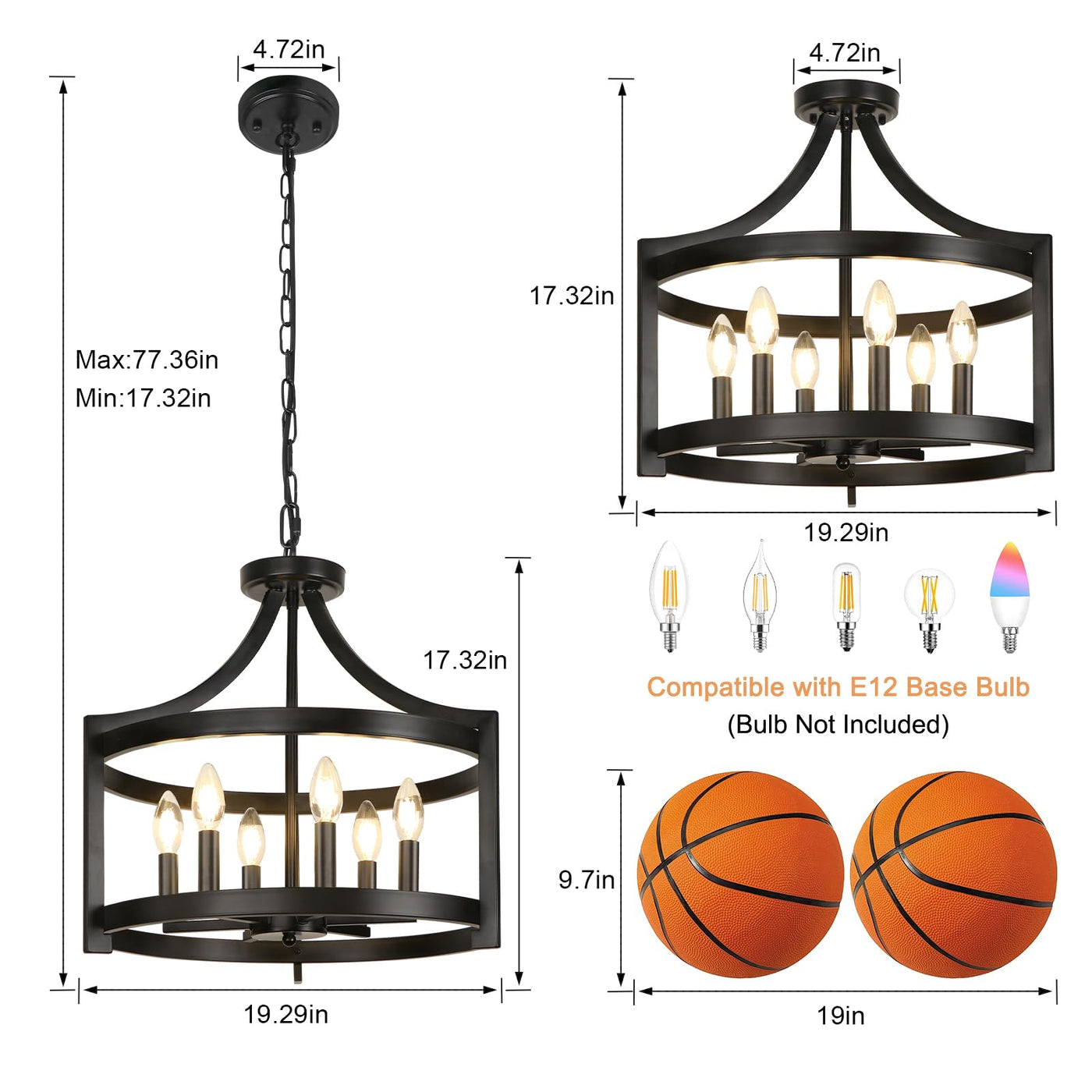 Description This elegant black metal round cage chandelier, featuring six candelabra light heads, creating a naturally unique charm. The entryway lighting fixtures ceiling have an 19'' diameter and come with a 59'' adjustable chain, it shifts effortlessly between heights of 17.32 to 77.36 inches, accommodating the vertical dimension of any space. The versatile chain installation allows for either hanging or flush ceiling mounting, making it a stunning centerpiece in any room. Supporting six E12 bulbs, the dining room light fixtures over table adapts to various bulb types, seamlessly enhancing dining areas, living rooms, or bedrooms with a warm and enchanting glow. Specifications Product Name: 6-Lights Large Modern Farmhouse Chandelier Color: Black Size: Diameter of the light fixture: 19.29 inch Length of chain: 59 inches Total height: 15 to 74 inches adjustable Diameter of the ceiling base: 4.72 inch Material: Metal Power: Max of one bulb is 40W Voltage: 110-120V Applicable Bulb Type: 6 of E12 bulbs need, recommended candelabra type bulb.(bulbs not included) Dimmable: Fully dimmable when using dimmable bulbs and compatible dimmer switch(Not Included) Adaptation Style:Farmhouse, Rustic, Modern and so on Applicable Scene:Dining room, Kitchen, Bedroom, Foyer, Entryway, Hallway, Living room Warm Prompt: 1. Please install it by a licensed electrician. 2. Please make sure you have cut off the electricity supply before installation. 3. For the longer service life, Please use it in dry environment. 4. This light fixture are divided into parts in package and it needs to assemble. 5. Please refer to the size details before buying, the light fixture may look smaller or bigger on website. 6. If the light fixture you received are damage, please send us message first.