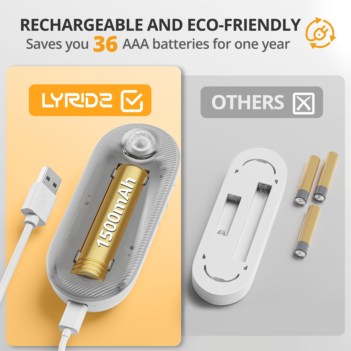 Q: How long does the battery last for the Lyridz Rechargeable LED Closet Light?A: The Lyridz Rechargeable LED Closet Light features a built-in 1500mAh customized rechargeable lithium battery that can sustain up to 120 days of daily use on a full charge, requiring only 3 recharges per year under typical conditions.
