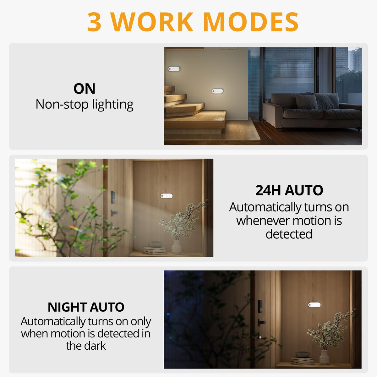 Three Modes: Customize your lighting experience with three distinct modes: ON for continuous lighting, NIGHT-AUTO for automatic activation in the dark, and 24H-AUTO for detection at all times. This flexibility caters to your individual nighttime lighting needs.