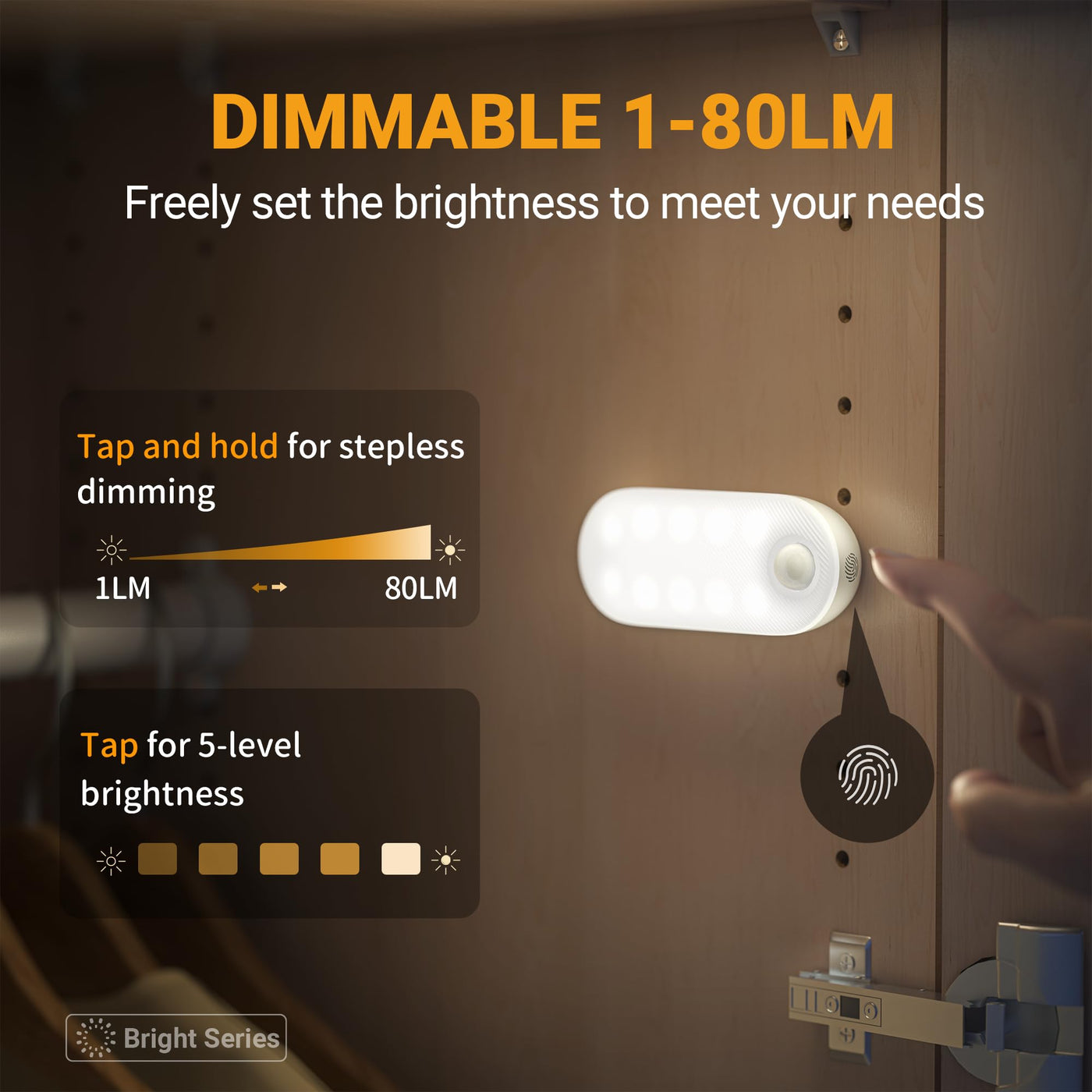 Q: What are the brightness options available with this motion sensor light?A: This closet light is equipped with 10 high brightness LED beads, offering adjustable brightness from 1 to 80 lumens. This allows you to customize the lighting according to your specific needs and preferences in various settings.