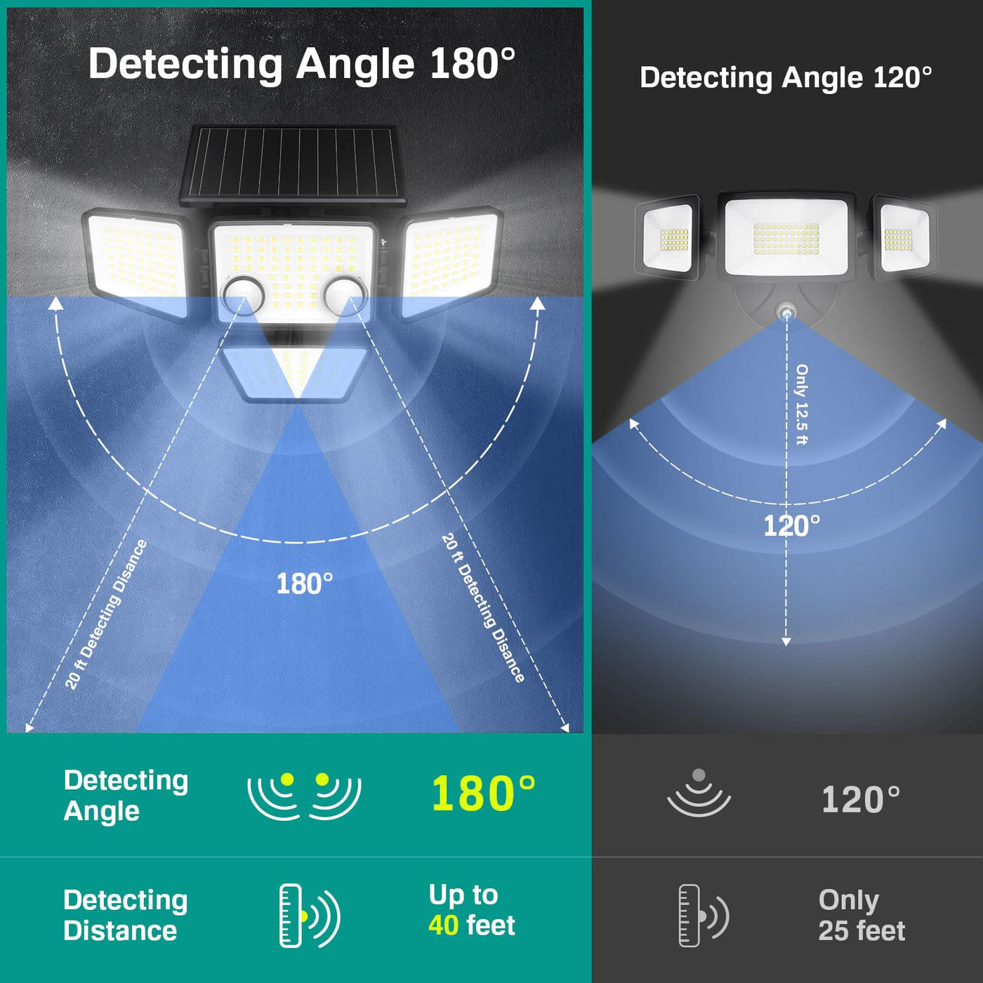 Q: What is the motion detection range of these lights?A: The Solar Outdoor Lights can detect motion up to 40 feet away within a 180-degree range, providing a broader coverage area for enhanced security.