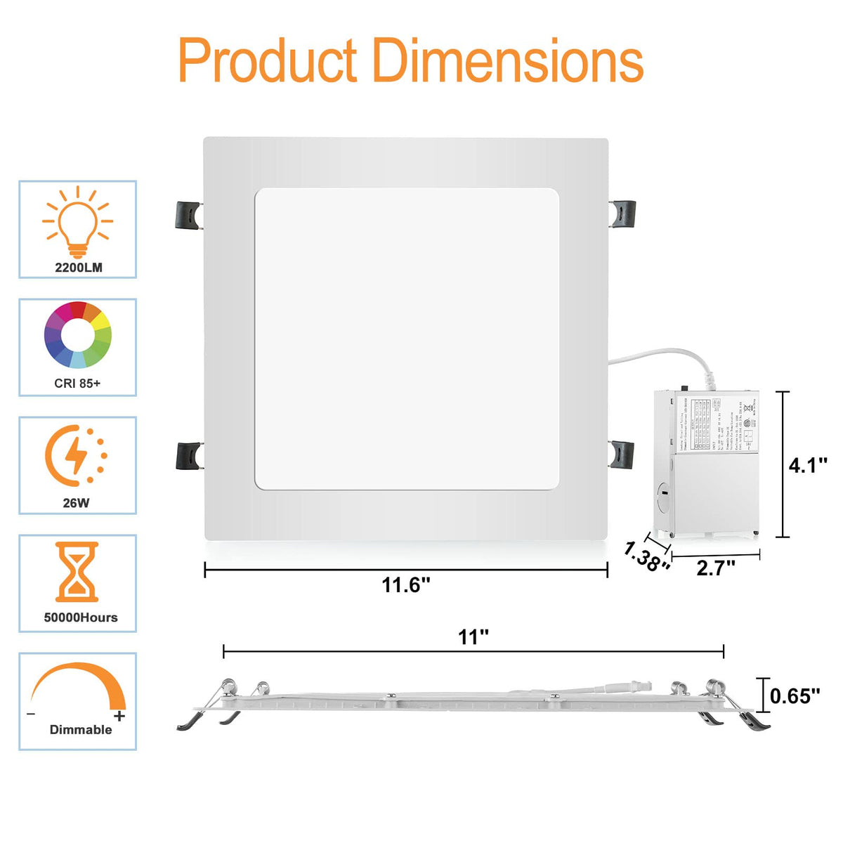 From The Manufacturer This 11 Inch 3 Colors Selectable 26W Led Square Recessed Light Can Be Fitted Your House For Your Most-Desired Color,Achieved Energy Saving And High Brightness With Dimming.. ?Led Round Ceiling Lamp Features: ? Ultra Slim Design: Only 0.7 Inch. ? Super Bright :2200Lm.240 Pcs High Quality Led Chips, Much Brighter. ? Warm White:3000K ? Neutral White:4500K ? Daylight White:6000K. ?Recessed Led Recessed Light Parameters: ? Input Voltage: Ac110V 50/60Hz ? Working Temperature:-20C-45C ? Lumen: 2200Lm ? Size: 11.6*11.6*0.7 Inches ? Power: 26W ?How To Install The Led Ceiling Lighting Fixtures Installation Instructions. Step1: Cut 10.8-11 Inch Hole In The Ceiling. Step2: Place The Junction Box In And Connect The Corresponding Wires. Step3: Put The Box In The Ceiling Hole. Push Up The Spring Clips. Step4: Push The Light Into The Ceiling,Then Finish Installation. ?Attention: 1.Please Kindly Read The User Manual Before Installation. 2.The Recessed Lights Are Not Waterproof And Are Suitable For Indoor. ?Application: -Widely Used For Bedroom, Living Room, Dining Room, Kitchen Office And Restrooms, Et. ?Whats In The Package: -4 X 26W Square Led Recessed Light -4 X Junction Box -1 X User Manual -12 X Wire Nuts -12 X Connector