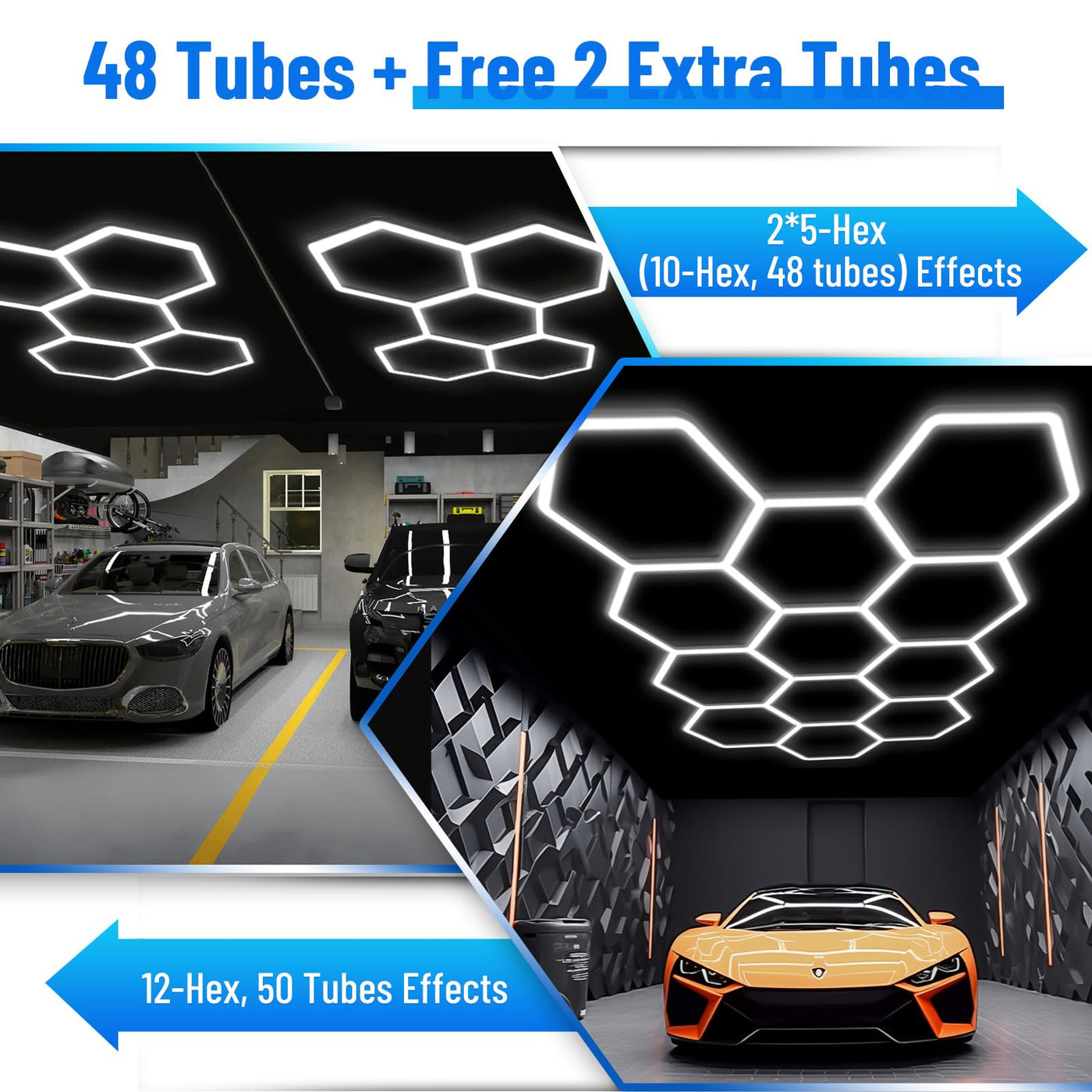 LED SHOP LIGHT FOR GARAGE This hexagon patterned Garage light LED workshop lighting system is designed for versatility and optimal illumination. Easily mountable on walls or ceilings using screws and zippers, this innovative lighting solution transforms your garage into a well-lit workspace, enhancing both functionality and aesthetics. DIY Diversity Installation Effect: Customize your lighting setup by arranging the tubes into unique shapes that reflect your personal style, creating a premium ambiance tailored to your space. Advantages of This Garage Light: 1. **Wider Light Emission**: Larger lamp tube design provides a broader and brighter light spread, ensuring comprehensive illumination. 2. **Enhanced Brightness**: With an output of 52800 lumens powered by high-quality LED chips, this fixture guarantees exceptional brightness. 3. **Safety First**: Equipped with a built-in plug that meets U.S. safety standards, minimizing electrical hazards. 4. **Stable Installation**: Tightly integrated design prevents loosening over time, ensuring long-term reliability. 5. **DIY Flexibility**: Personalize your lighting arrangement to suit your preferences effortlessly. Specifications: ? Power: 480W (10W per lamp tube) ? Lumen: 52800Lm ? Color Temperature: 5000K ? Size: 124.2 inches x 89.8 inches (10 grids) ? Working Temperature: -20°C to 50°C ? Input Voltage: AC 85-265V Package Includes: - 2 x 5FT long power cables with US plugs - 1 x hard-wired power cable - 50 x 10W Light Tubes - 16 x "V" Connectors - 23 x "Y" Connectors - 39 x Screws - 39 x Anchoring - 39 x Nylon cable ties - 3 x Nuts