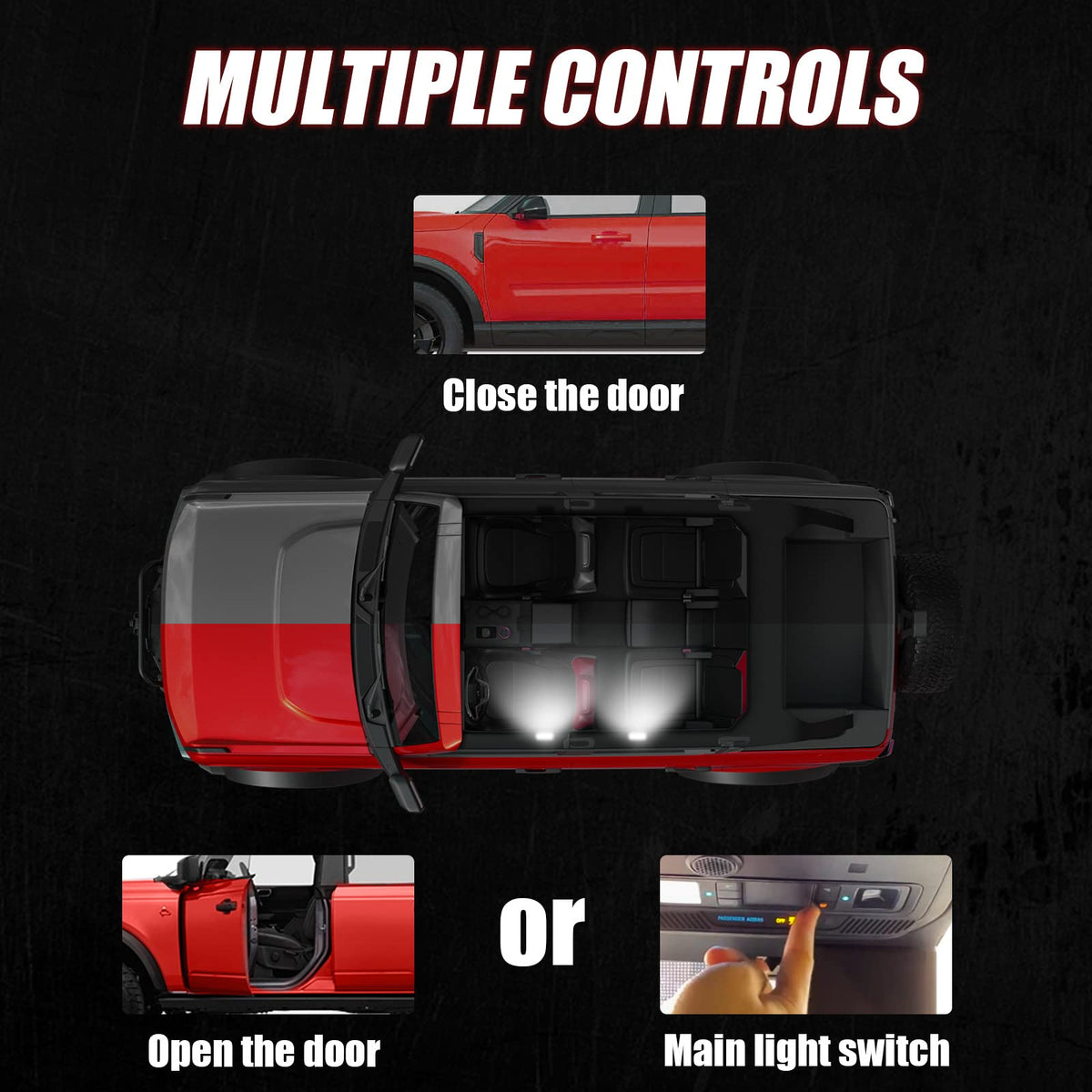 Q: Does the interior dome light automatically turn on when the doors are opened?A: Yes, the Mabett LED Interior Dome Light is designed to operate automatically. When the doors of your Bronco are opened, the dome light will turn on, providing instant illumination, and it will turn off when the doors are closed.
