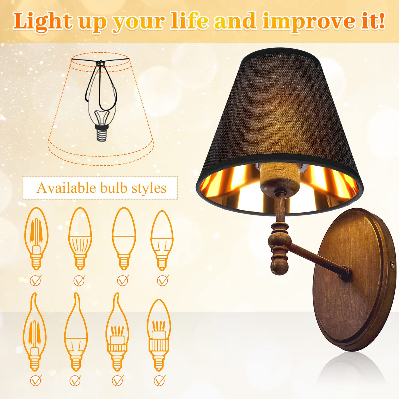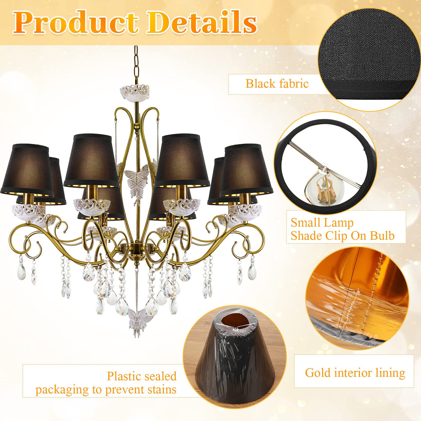 Features: Lampshades for table lamps adopt gold and black colors, vintage and delicate, not easy to break or deform, 10 pieces can satisfy your use and replacement needs. Chandelier light covers are clip on design, easy to install, not easy to fall off, which can make your light gentle, comfortable and not harsh, you can also share them with others. Specifications: Material: cotton fabric, PVCColor: black, goldSize: 7.5 x 15 x 13 cm/ 3 x 6 x 5 inchesPackage includes: 10 x Clip on lampshadesNotes: Manual measurement, please allow slight errors on size. The color may exist a slight difference due to different screen displays.