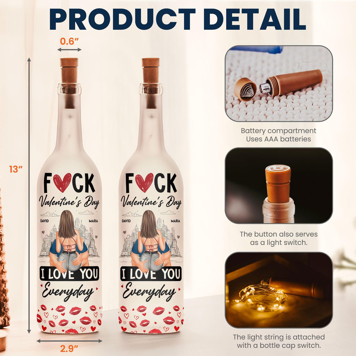 Light up your love with this Custom Bottle Lamp, the perfect gift for couples who want to celebrate their special bond. Whether its for an anniversary, Valentines Day, or just to show your partner how much they mean to you, this beautifully crafted lamp adds warmth and romance to any space. Personalize it with names, dates, or a meaningful message to create a unique keepsake that symbolizes your love story. With its soft, glowing light and elegant design, this bottle lamp is both a stunning decor piece and a heartfelt reminder of your connection. ??? Perfect for creating cozy moments together!