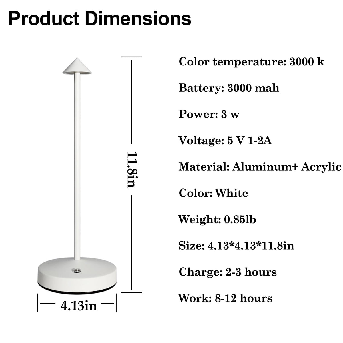 Q: How long does the battery last on a full charge?A: With a 3000mAh battery, these cordless table lamps can last between 8 to 12 hours on a full charge, providing you with ample lighting for various activities.
