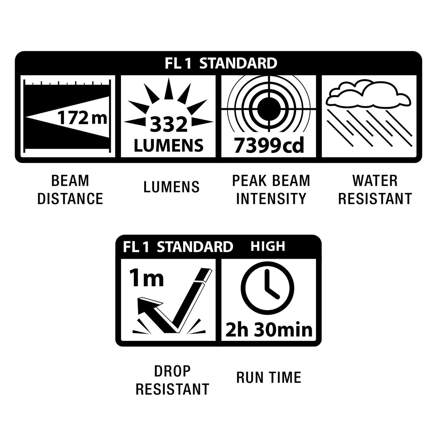 Highlights: Lumens: 332 lumens Color: Green Bulb Type: LED Length: 6.61 Height: 1 Width: 1 Battery Size: AA Battery Number of Batteries Required: 2 Battery Pivoting Light: No Casing Material: Aluminum Impact Resistant: Yes Beam Distance: 172 M Hands Free Capability: No Run Time: 2.5 hour Batteries Included: Yes High and Low Switch: No Waterproof: No Rechargeable: No Battery Type: Alkaline Twist head to turn on-off-focus 1m drop resistant Packaging Type: Clamshell