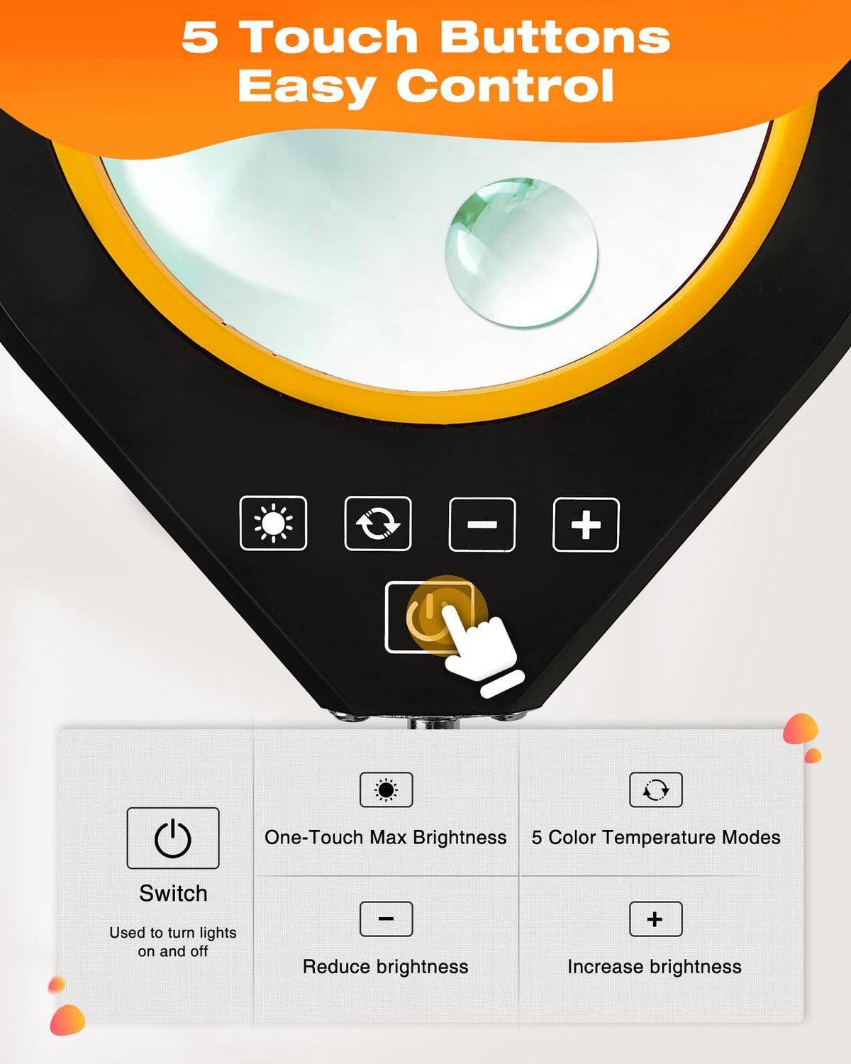 Q: How does the touch panel work on this magnifying lamp?A: The magnifying lamp is equipped with an upgraded 5-key touch panel that allows you to easily turn the light on/off, adjust brightness levels, and switch between five different light modes for optimal visibility.