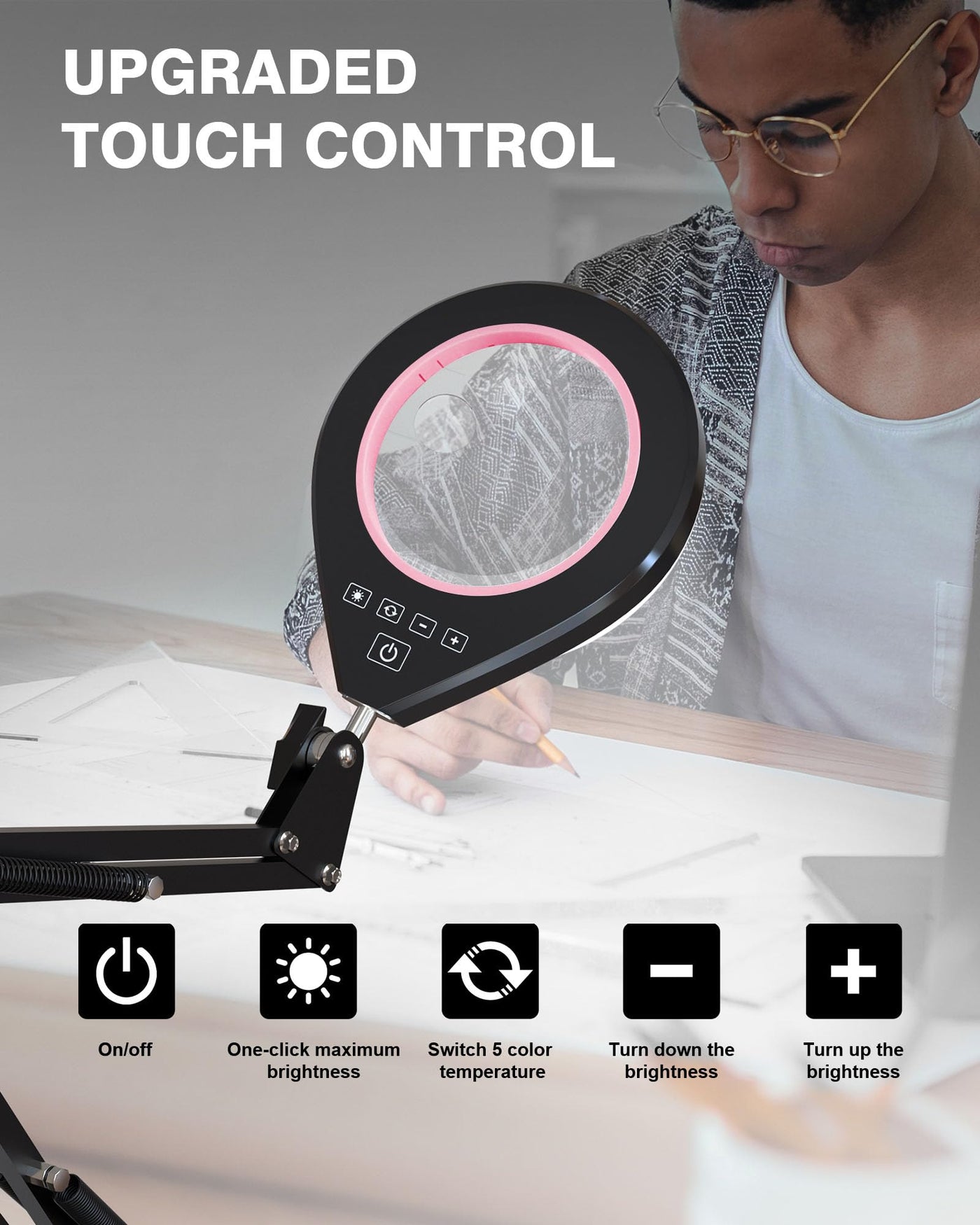 Q: How does the touch control panel work on the magnifier?A: The magnifying glass features an upgraded 5-key touch control panel that allows users to easily switch between 5 brightness modes and adjust the light intensity across 10 levels, making it convenient for quick adjustments during any task.